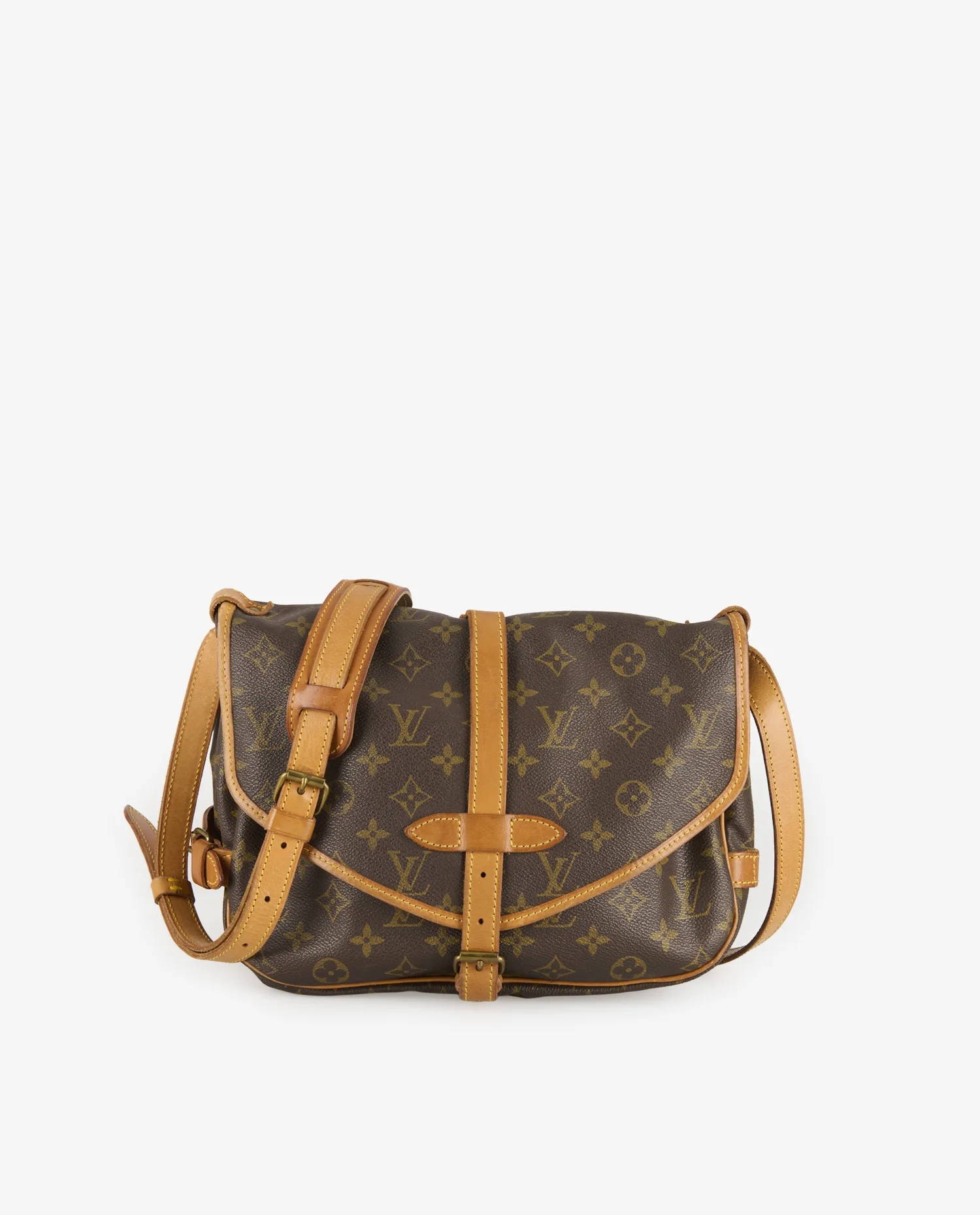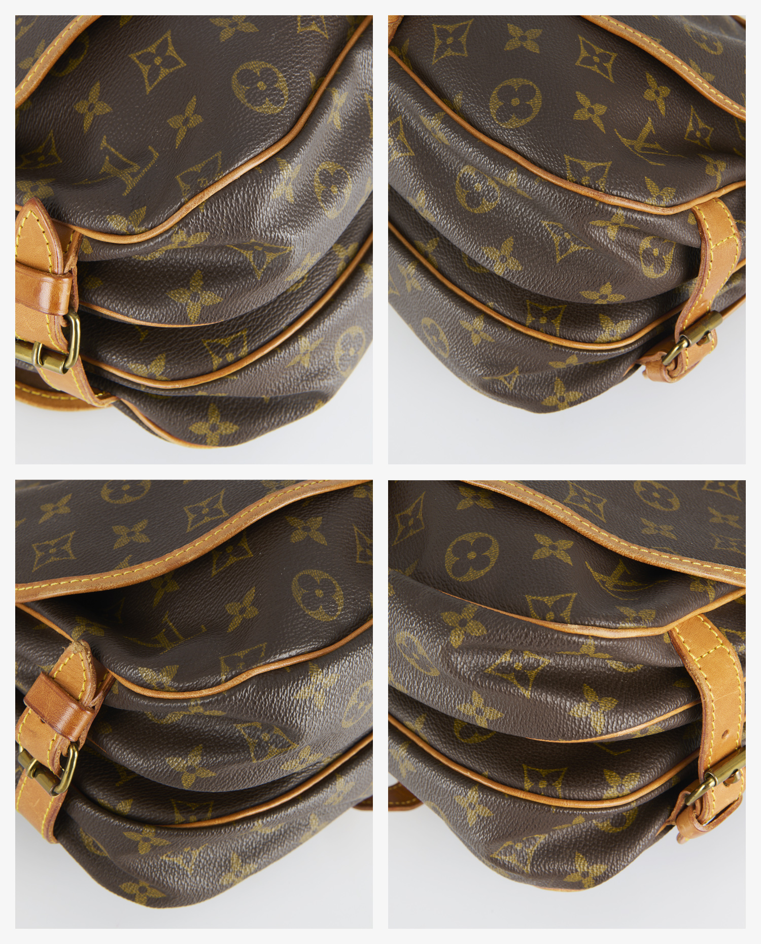 Cette sacoche Saumur est en bon état général. La toile Monogram reste solide et bien tendue, sans fissures. Les cuirs présentent une patine miel prononcée avec des marques visibles sur les bords et les coins, ainsi que quelques plis d’usage. Les coutures sont globalement solides, et les boucles fonctionnent correctement. Les angles montrent des traces d’usure caractéristiques d’un usage régulier, visibles sur les photos.