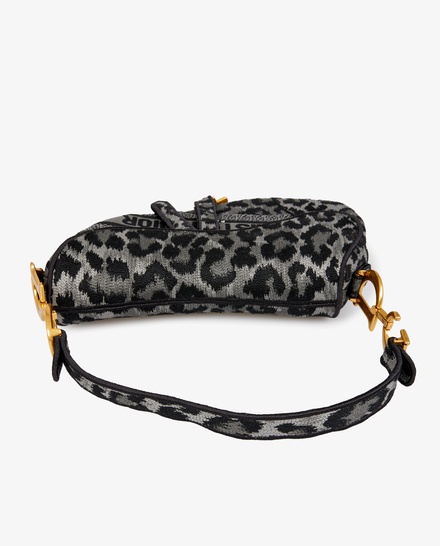 Le tissu jacquard présente un motif léopard gris foncé sur fond noir, à la fois graphique et texturé. La bande centrale avec la signature « CHRISTIAN DIOR » vient structurer visuellement le rabat incurvé. Les éléments métalliques, finition laiton doré vieilli, incluent les emblématiques crochets « CD » aux extrémités de la poignée et le charm « D » suspendu sur le devant. Le sac est conçu pour un porté épaule et conserve une silhouette sculpturale qui épouse la courbe du corps.