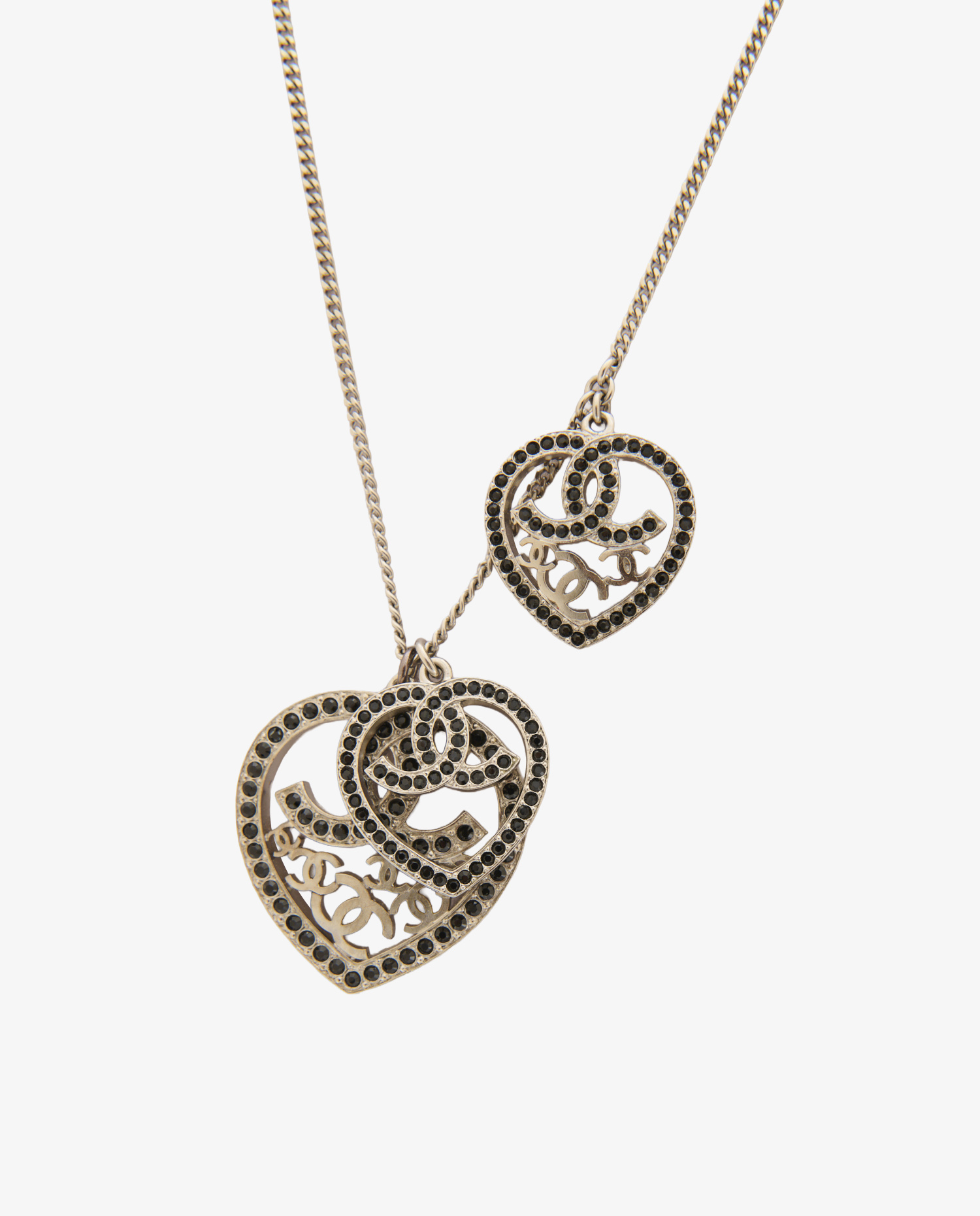 Le sautoir est composé d’une chaîne en métal argenté à l’effet légèrement patiné. Trois pendentifs distincts en forme de cœur sont suspendus à des hauteurs différentes : deux ornés de strass noirs et un plus petit, ajouré, en métal seul. Chaque cœur encadre un logo CC stylisé et des éléments décoratifs ajourés intégrant le mot “Chanel” en lettres cursives. Les strass sont sertis avec précision tout autour des contours, renforçant l’éclat du bijou. La longueur totale permet un porté allongé, typique du style sautoir.