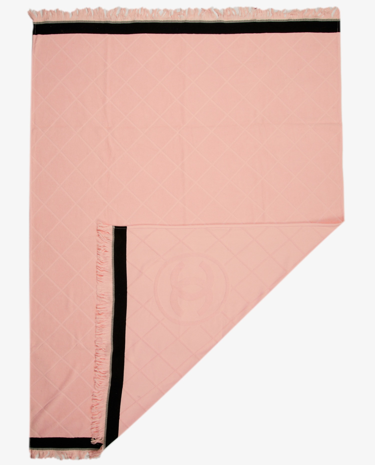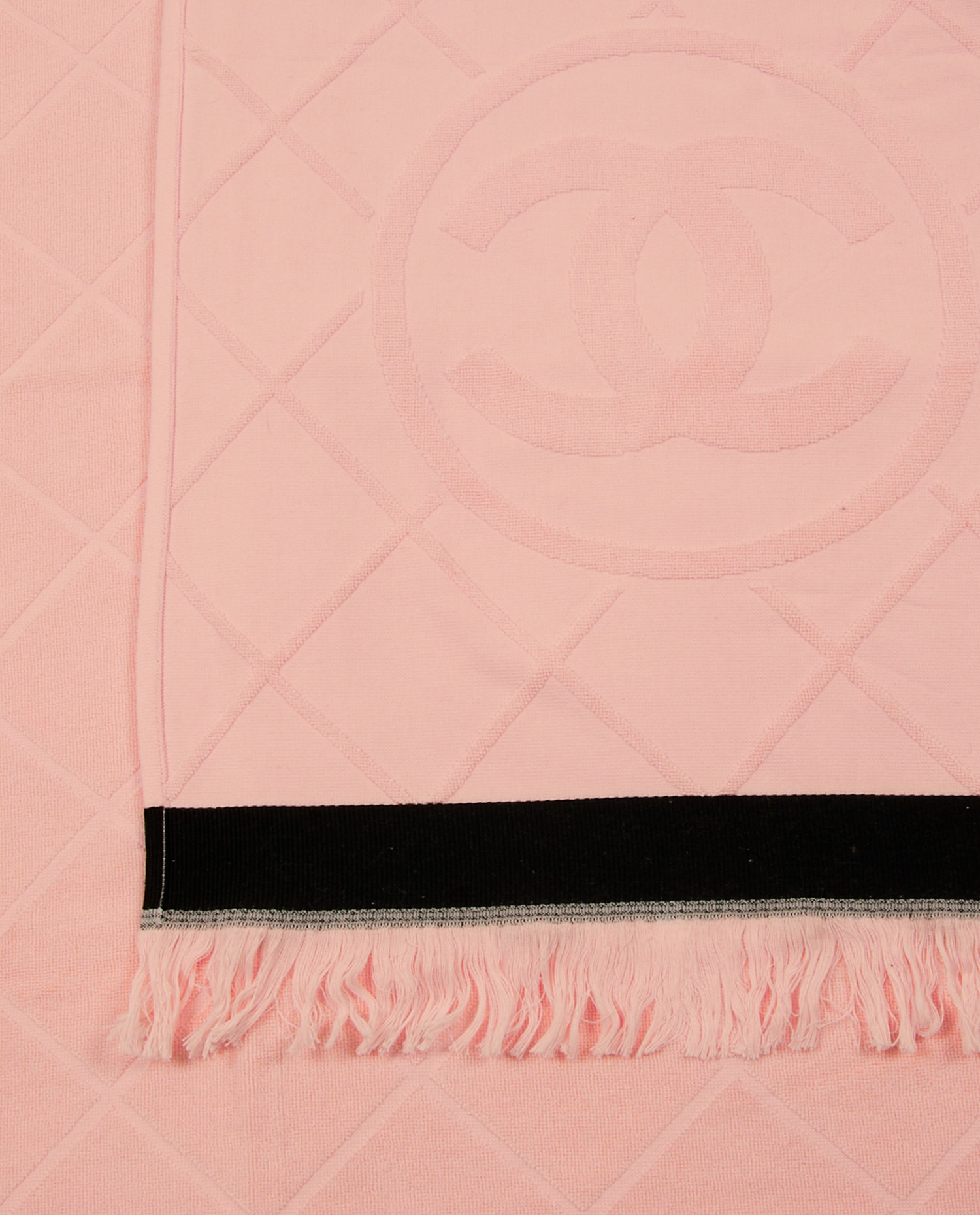 Serviette de plage en éponge de couleur saumon. Bordures noires. Jamais utilisé. Cadeau vip.