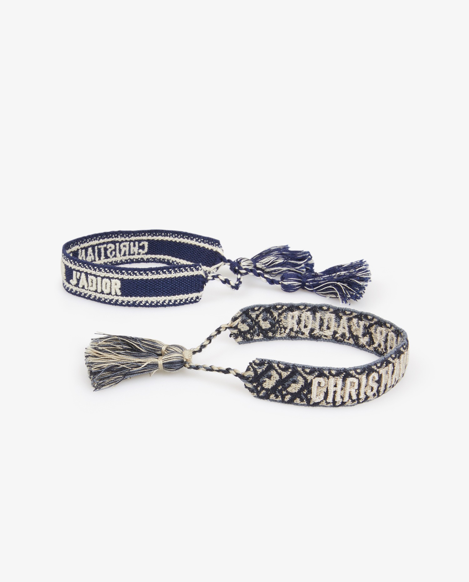 Set de deux bracelets Jadior en coton bleu marine brodé. Ils s’ajustent grâce à des cordelettes coulissantes à pompons faits à la main.