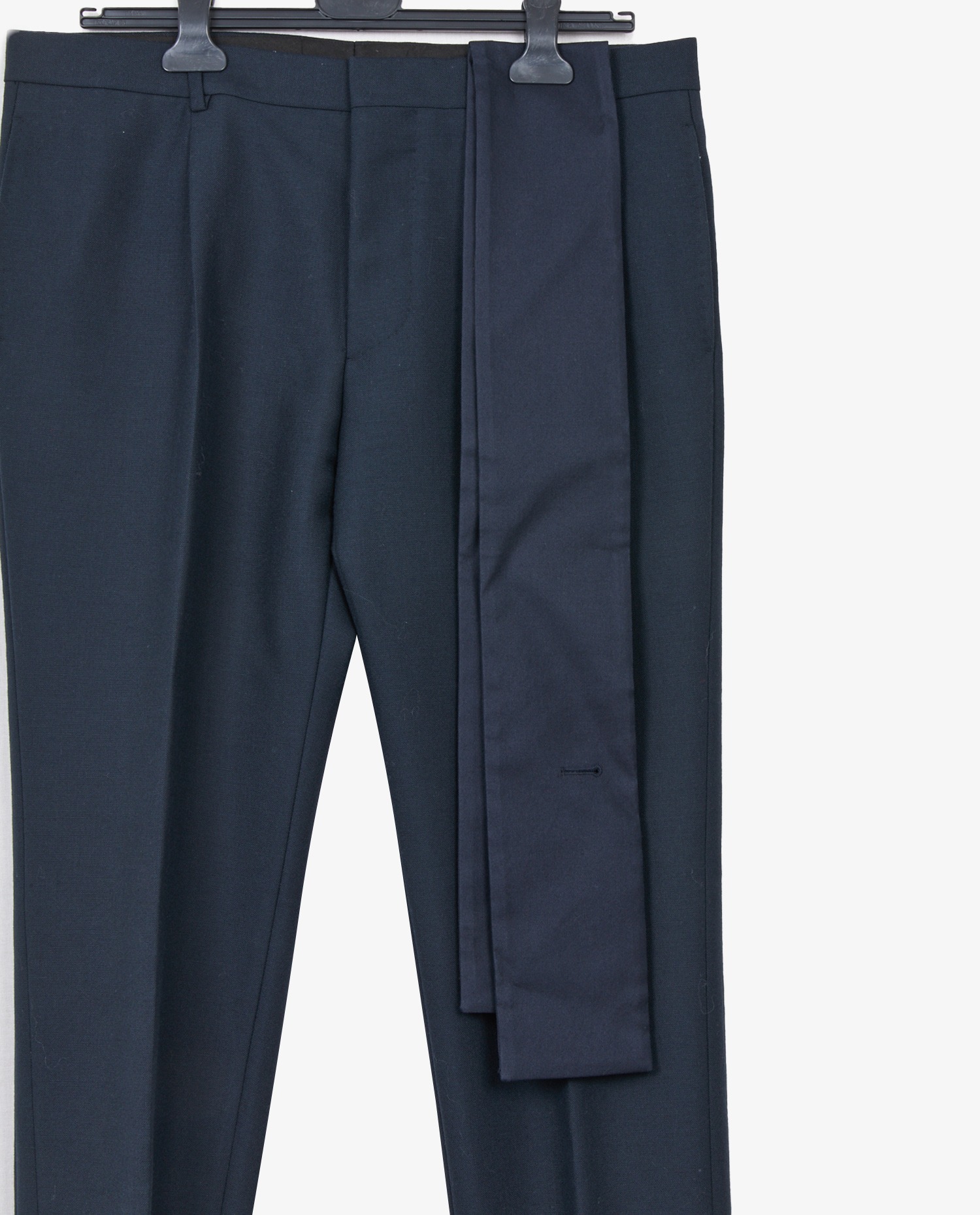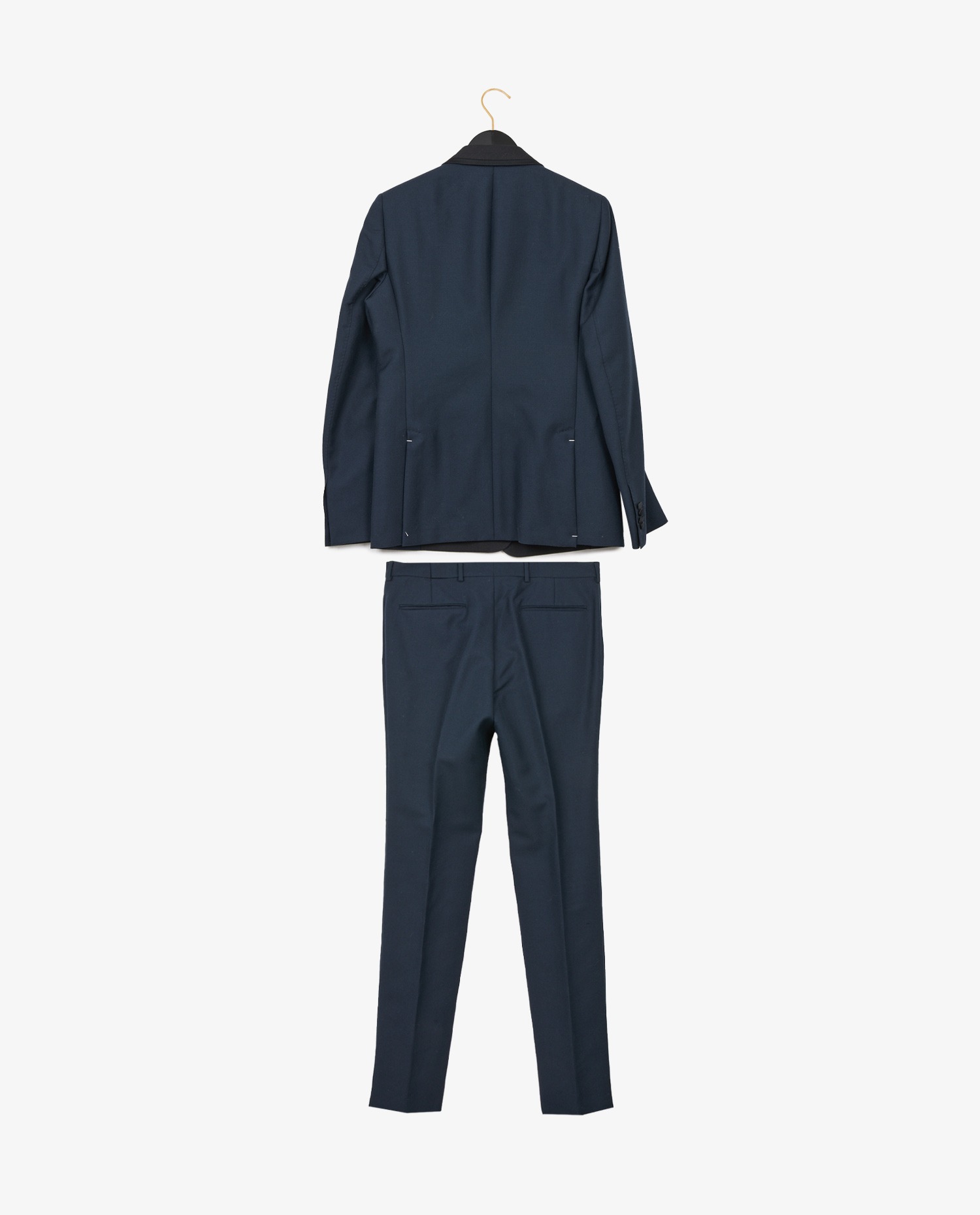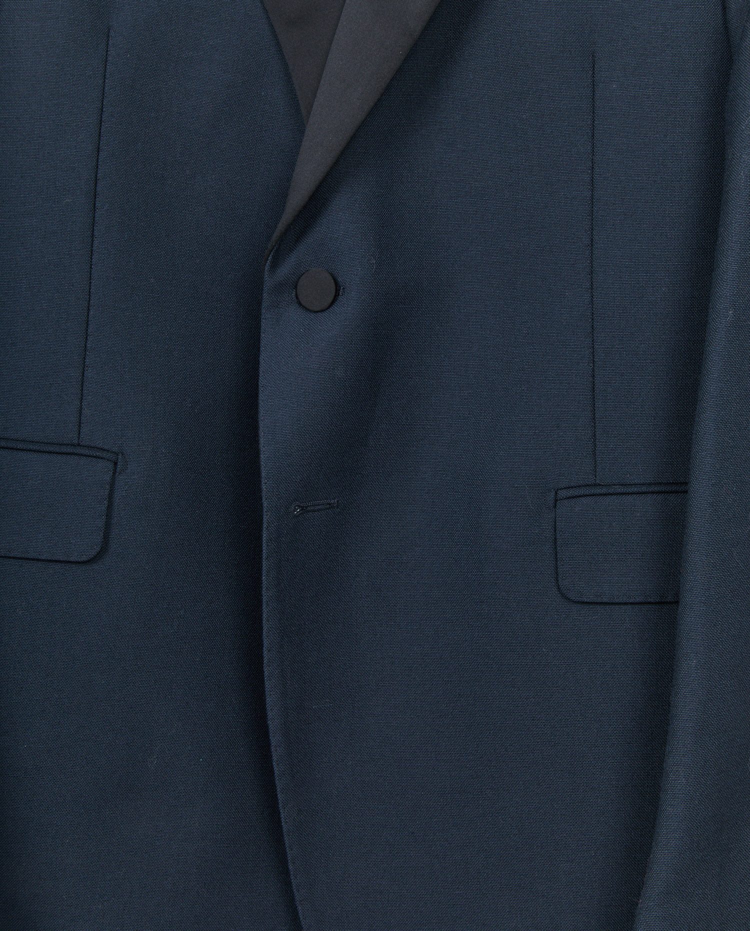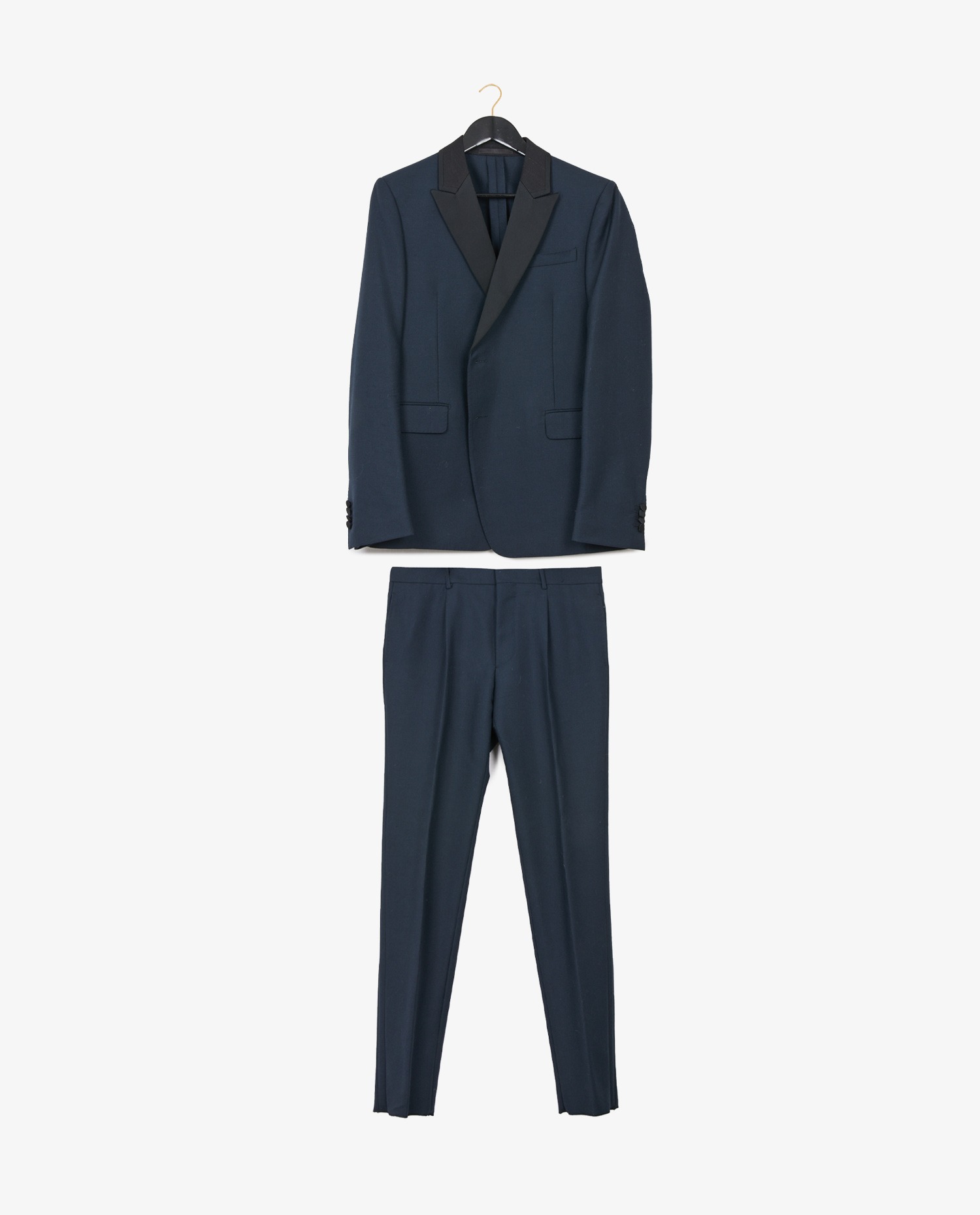 La veste arbore deux boutons recouverts de tissu sur le devant, une fermeture moins commune offrant une allure structurée et contemporaine. Les revers en pointe en satin noir créent un contraste subtil avec la laine bleu nuit. Deux poches à rabat à l’avant et une poche poitrine passepoilée complètent la ligne. Le pantalon assorti présente une coupe droite, un pli central marqué, et des finitions épurées. À l’arrière, deux poches passepoilées renforcent l’équilibre visuel. La ceinture courament appellée “cummerbund” en tissu identique constitue une alternative au gilet, dans la tradition du smoking formel.