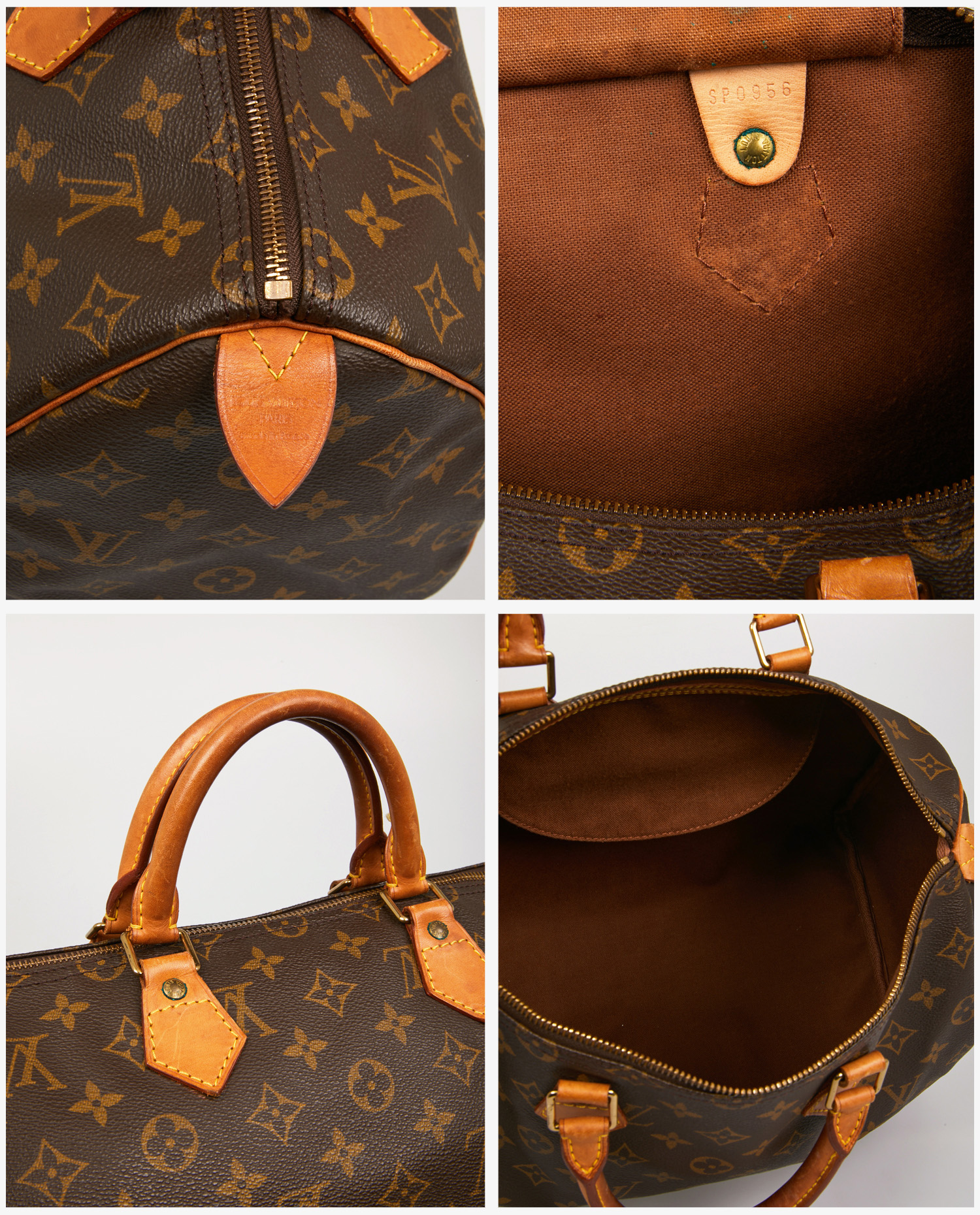Ce Speedy 35 est en très bon état général pour un sac datant de près de 30 ans. La toile est intacte, sans fissures ni trous. Le cuir présente une patine marquée, avec des traces d’eau, des plis sur les poignées et un assombrissement homogène. Les coins inférieurs montrent une usure modérée. Les coutures sont solides, la fermeture éclair est fonctionnelle, et l’intérieur est sain.