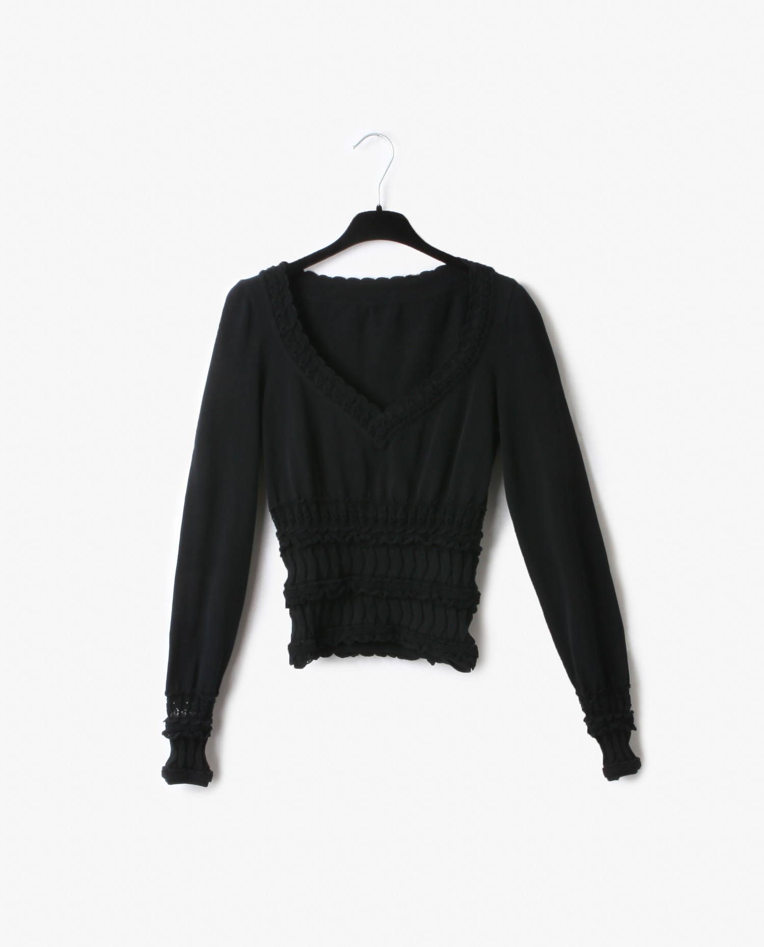 Top noir incontournable de la Maison Alaia signature des années 90, découpé de ganses élastiques à la taille et aux manches. Col V.