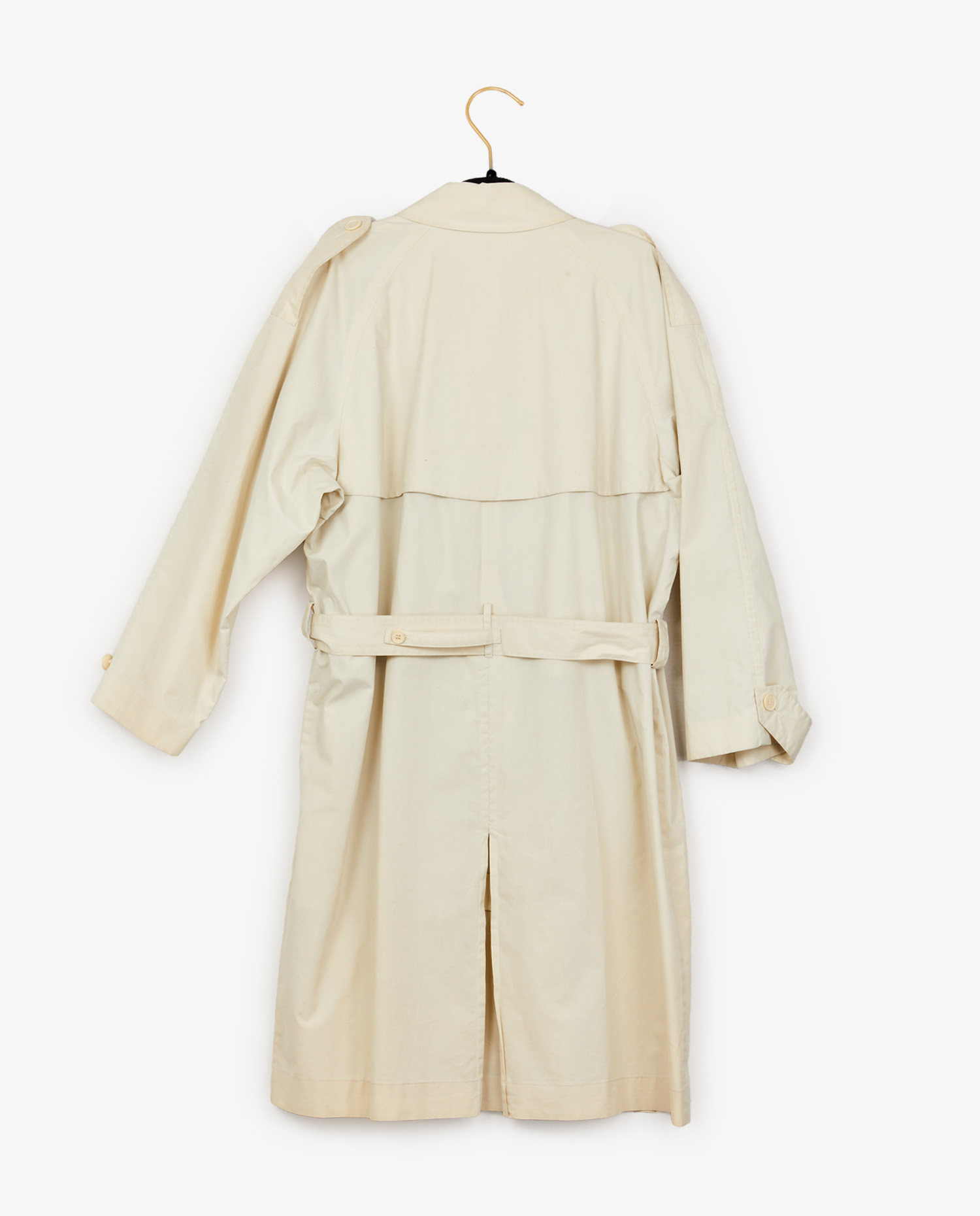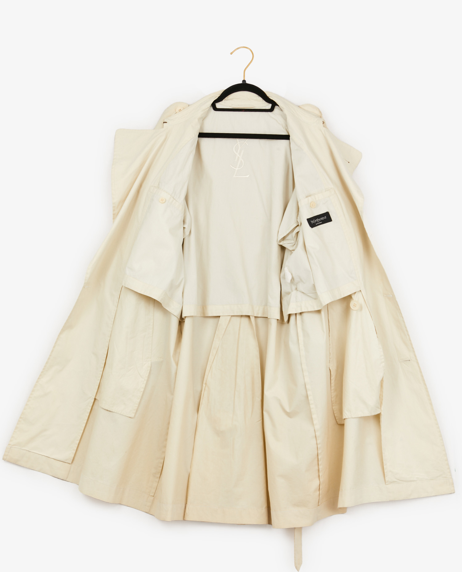 Trench vintage Yves Saint Laurent en toile imperméable beige. Deux poches à l’avant. Fermeture croisée ainsi qu’avec une ceinture afin de resserrer la taille. Taille 48. A l’intérieur, le sigle “YSL” est brodée. En très bon état.