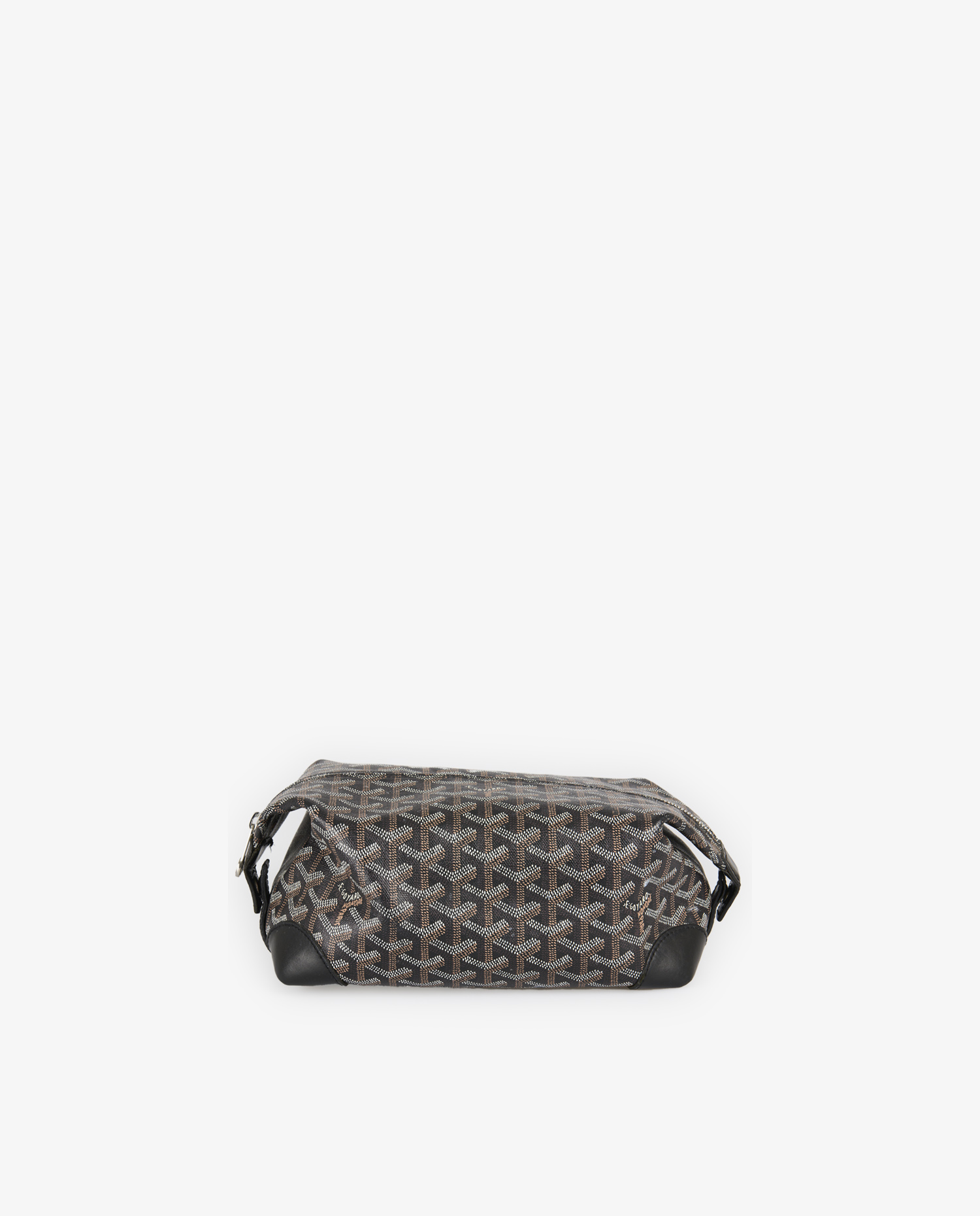 La trousse est réalisée en toile Goyardine noire et marron à motif chevron blanc, brun et beige, formé de petits points peints à la main. Les coins sont renforcés par du cuir noir lisse, apportant structure et solidité. La fermeture éclair métallique assure une ouverture fluide et sécurisée. Le logo « Goyard Paris » est discrètement intégré au motif sur la face avant. Les dimensions approximatives sont de 25 cm de longueur, 13 cm de hauteur et 12 cm de profondeur.