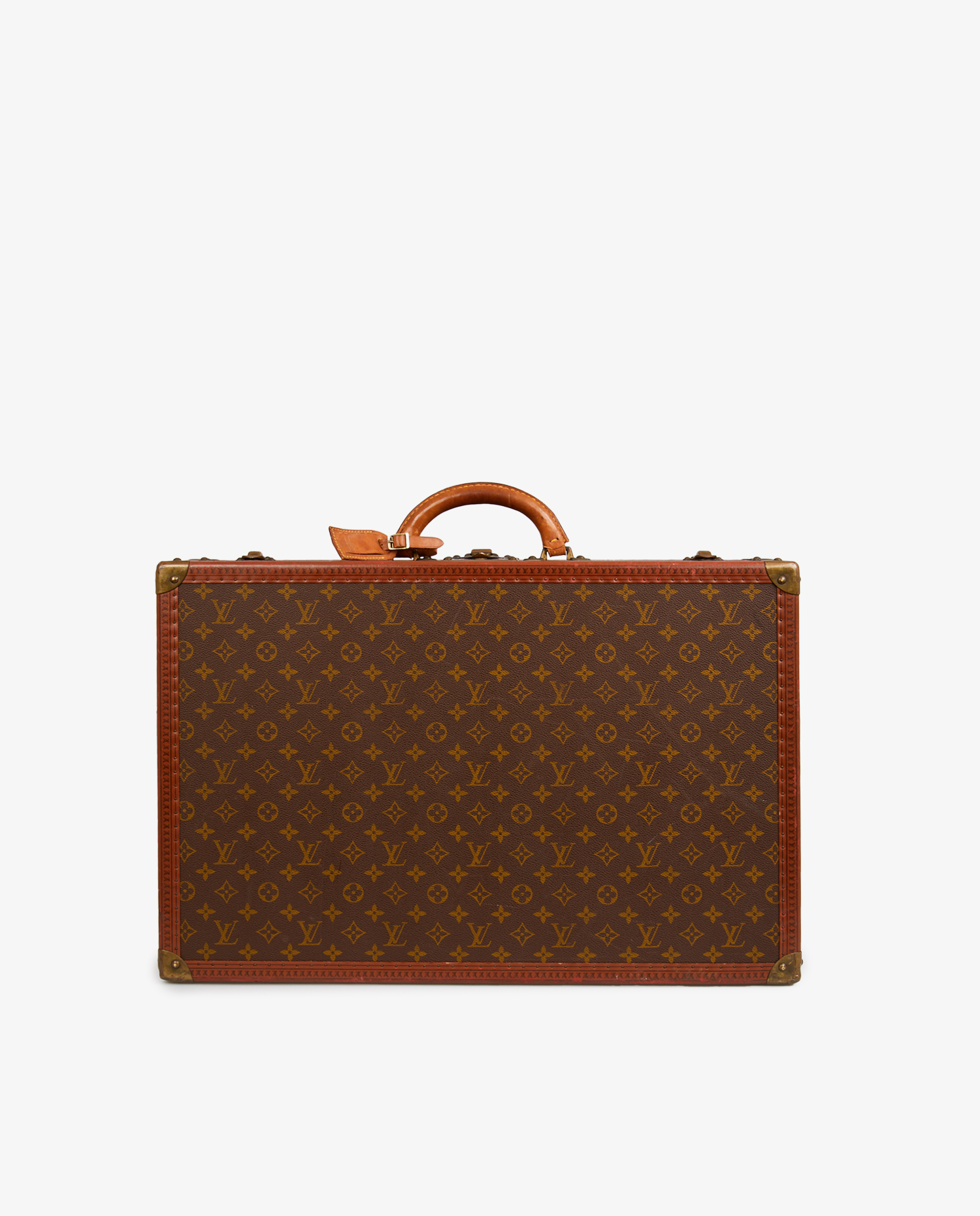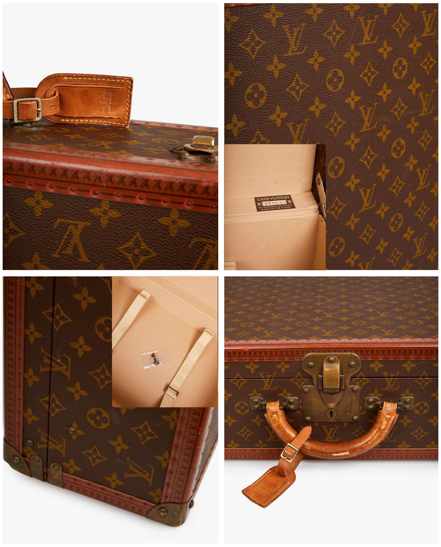 Valise Bisten 60 vintage Louis Vuitton toile Monogram. Ce modèle fait partie intégrante de l’héritage de la Maison de part sa ligne élancée et sa robustesse. L’intérieur est en toile avec des sangles de maintien. Serrure « S » Louis Vuitton avec clé, renforcée de deux loquets complémentaires. Les bordures sont en cuir renforcée de rivets et les angles sont en métal doré. Poignée simple arrondie en cuir. En très bon état. Prix public 9000 euros, en rupture de stock.