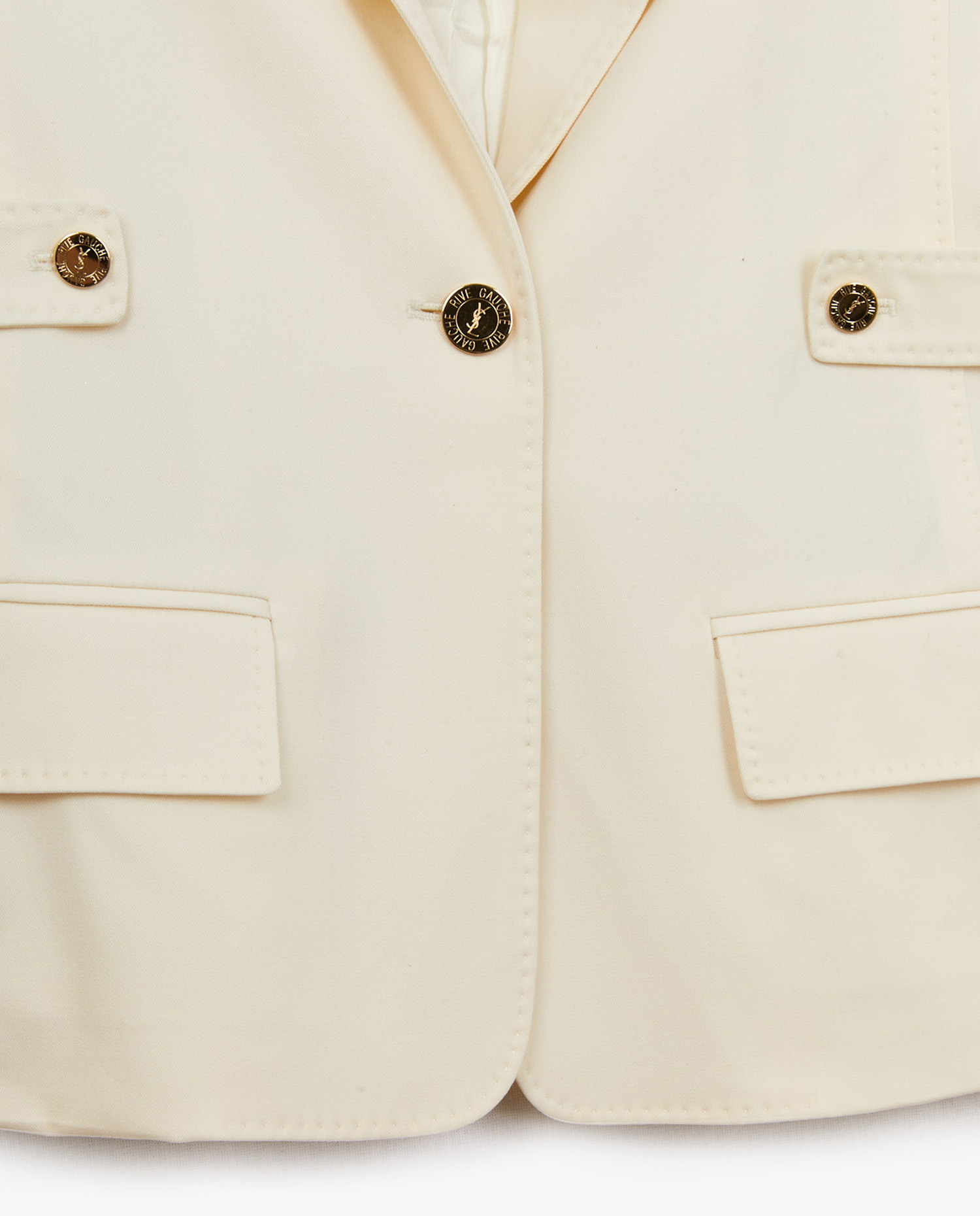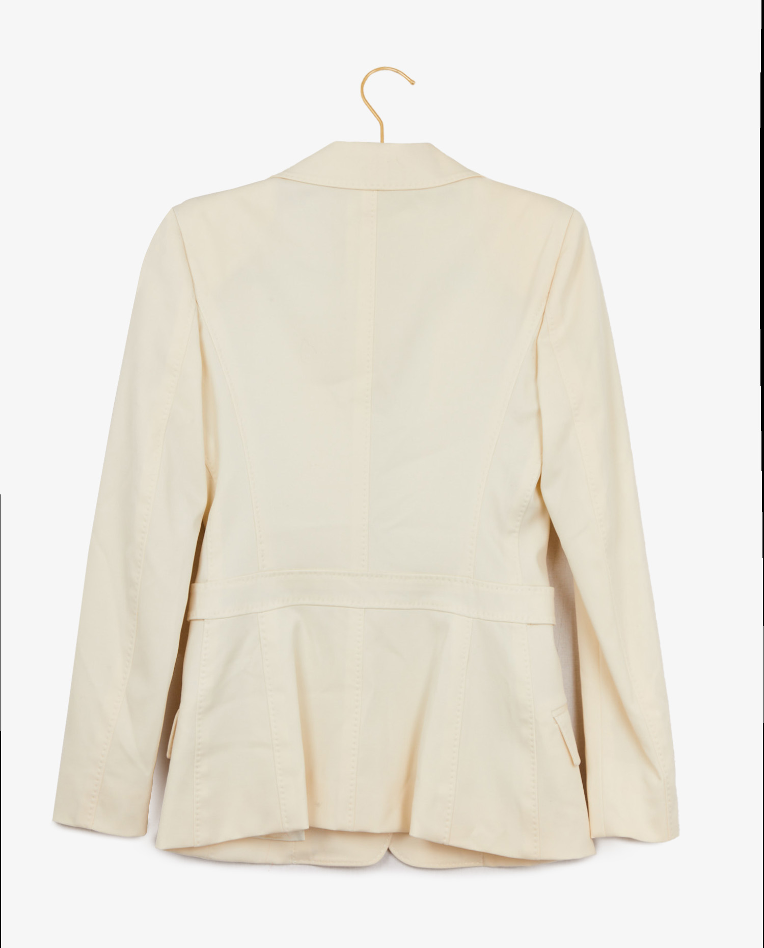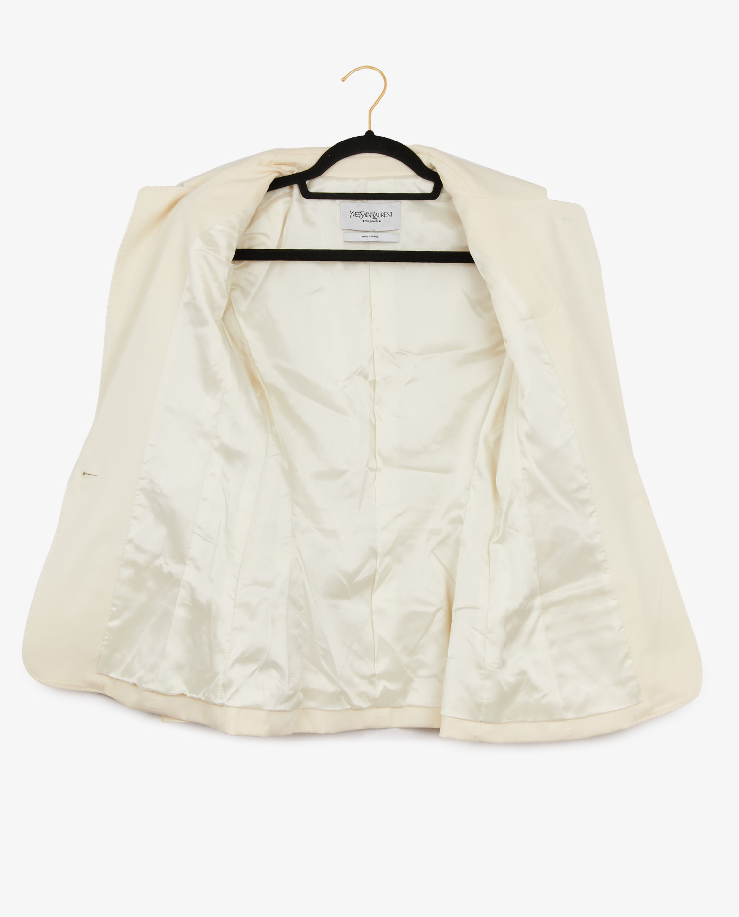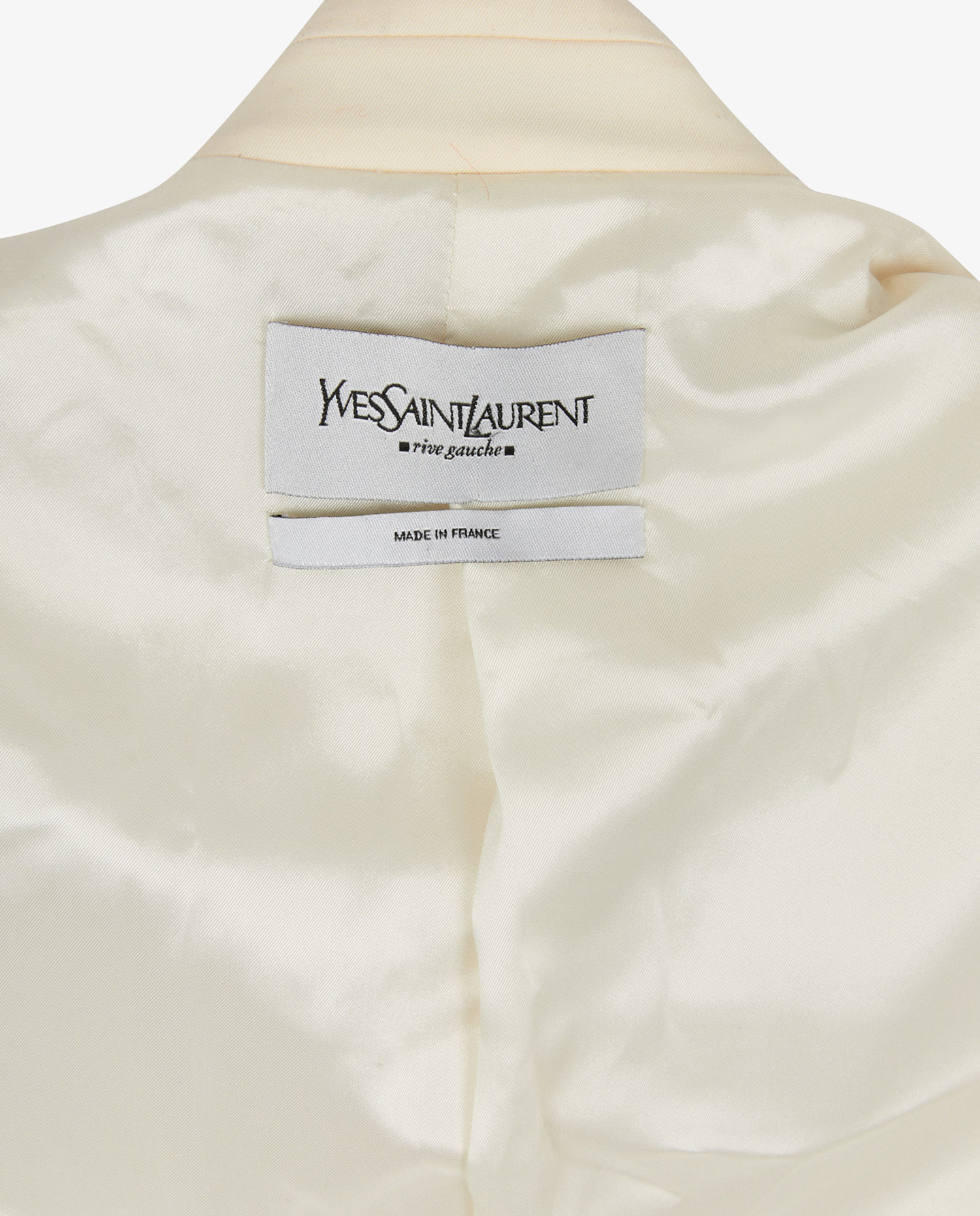 Veste Yves Saint Laurent blanche, cintrée à la taille et épaulettes. Epouse parfaitement les courbes du corps. En très bon état.