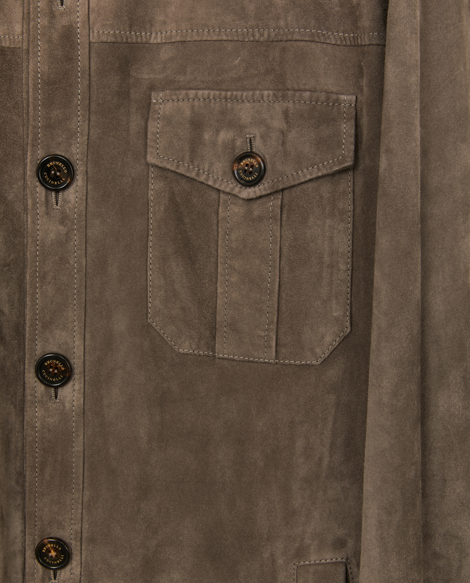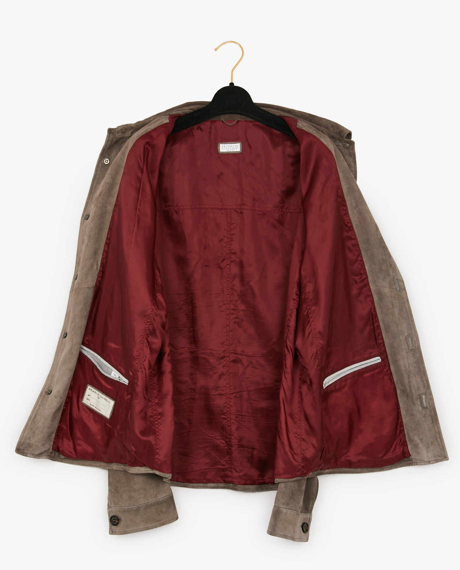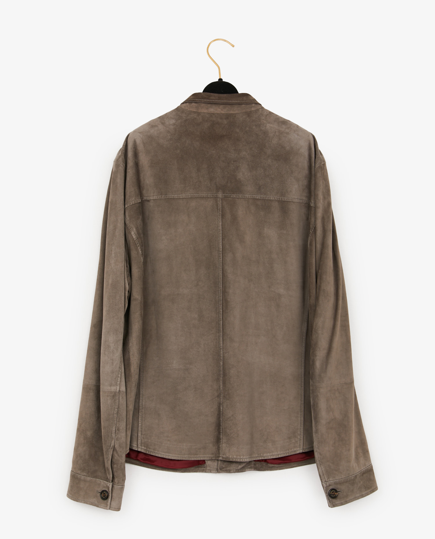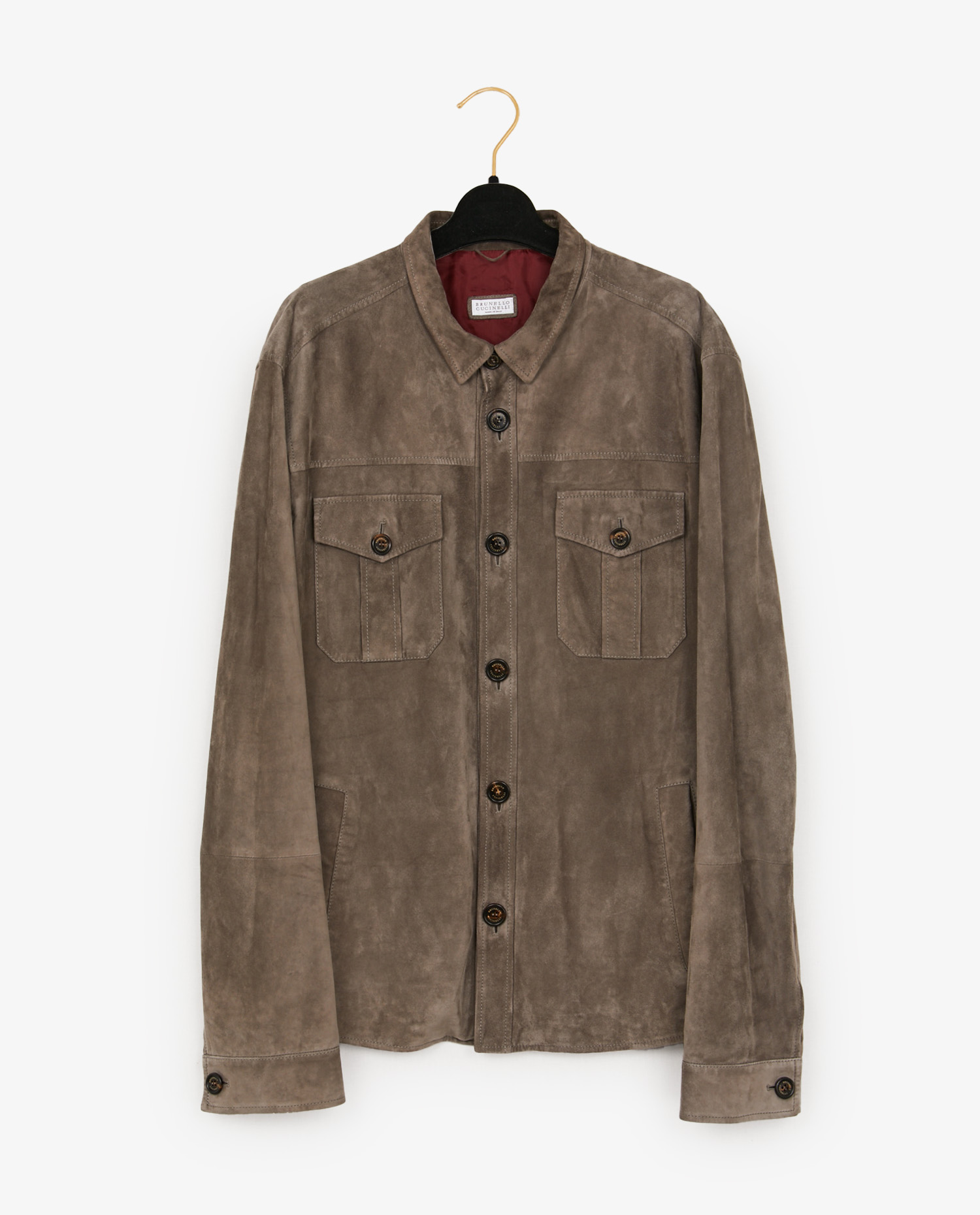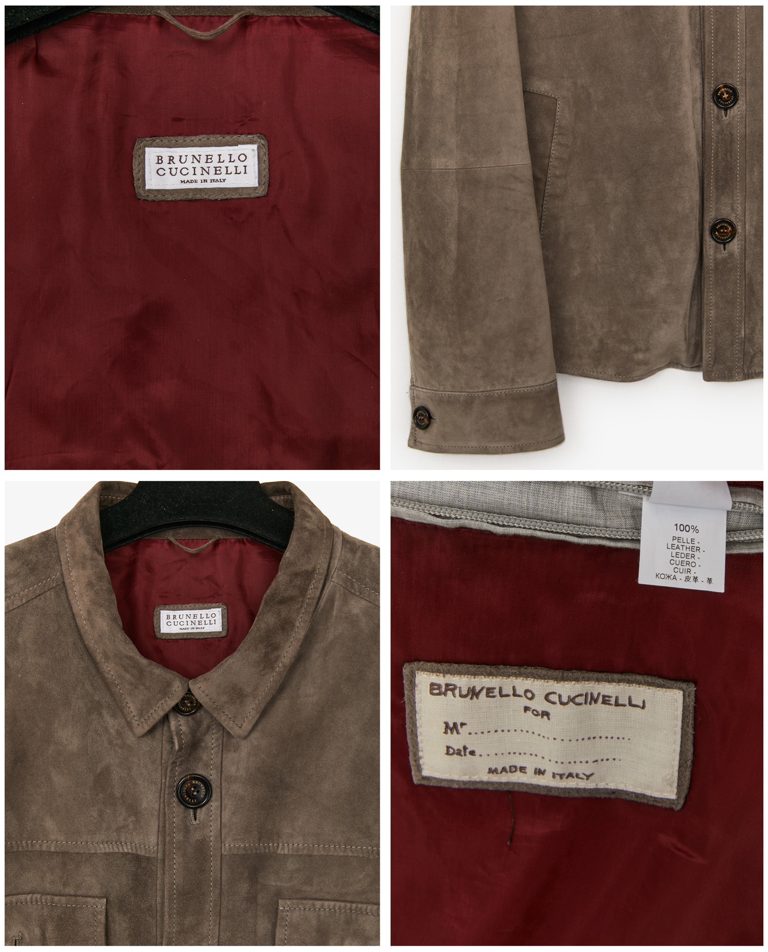 La veste est confectionnée en suède de veau dans une nuance taupe/gris clair aux effets légèrement marbrés, typiques des peaux naturelles haut de gamme. Les boutons en corne gravés “Cucinelli” renforcent l’authenticité artisanale de la pièce. Le col chemise classique, les manches boutonnées et la coupe droite participent à une silhouette facile à porter au quotidien comme en voyage. Les finitions sont précises et le cuir reste souple et respirant.