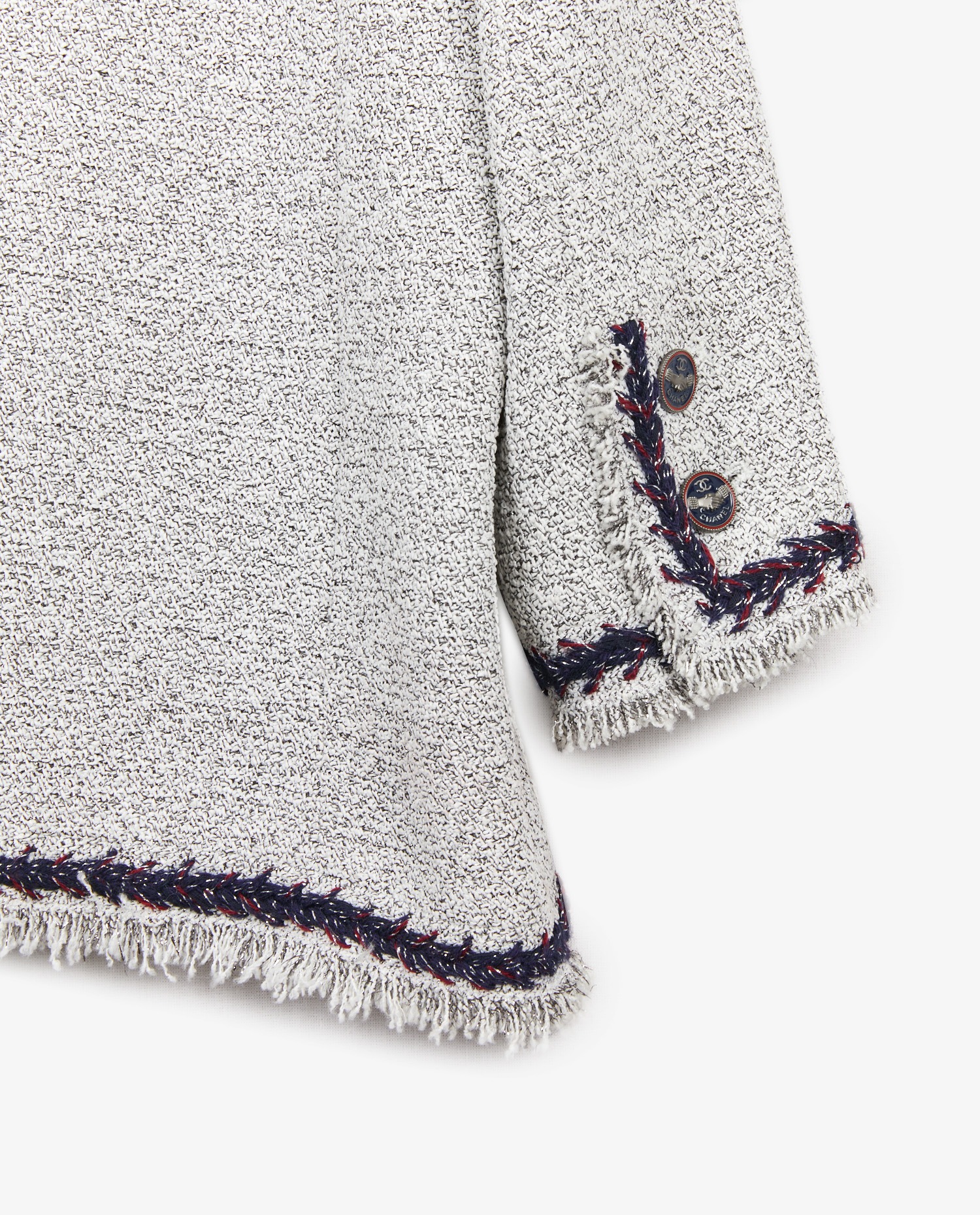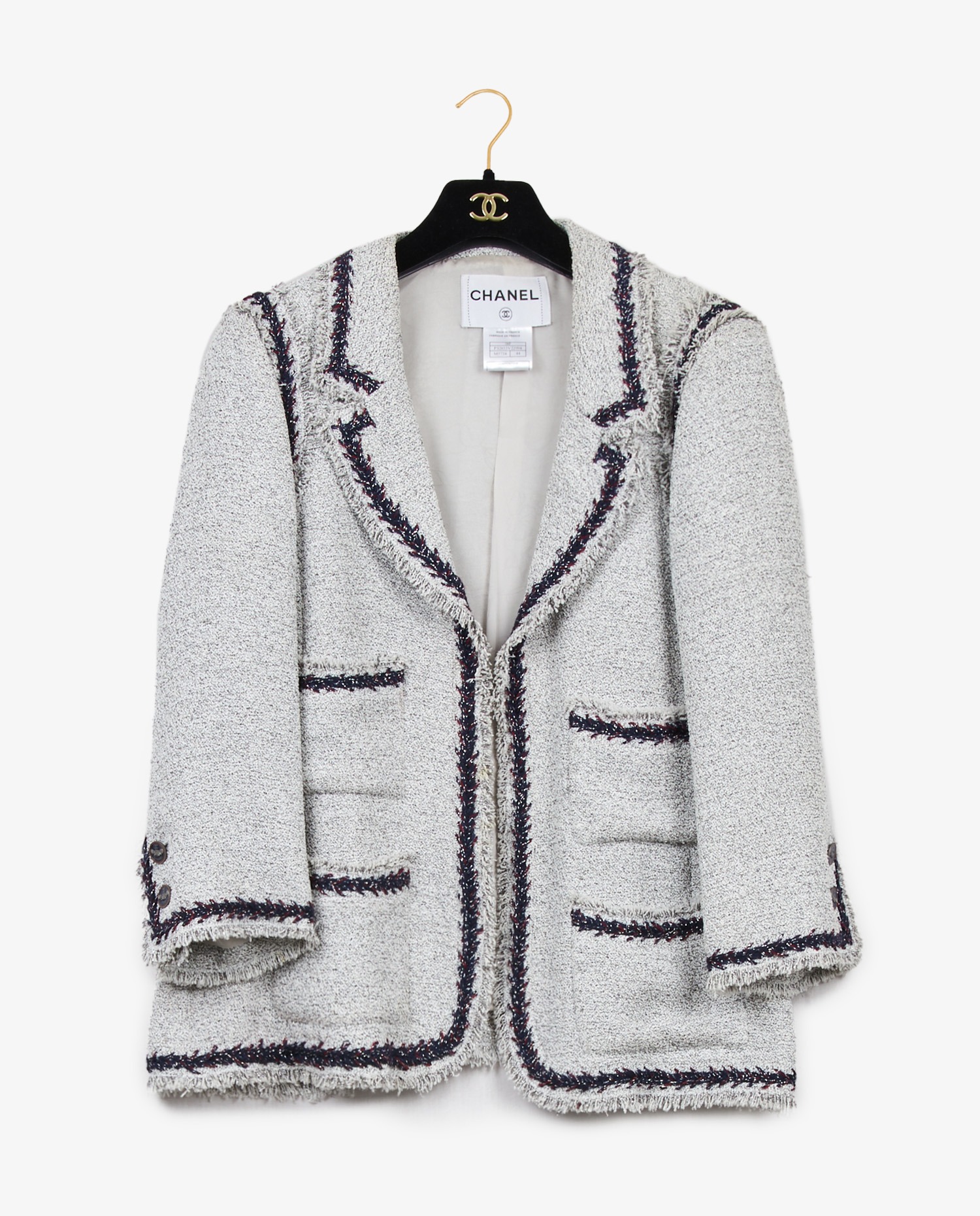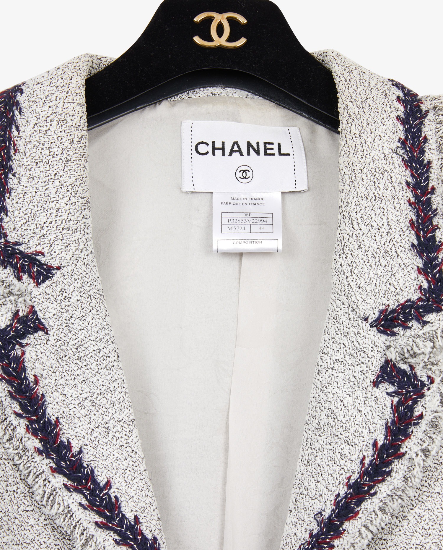 Veste Chanel en viscose paillettée argent et broderies en laine bleu marine et bordeaux. Doublure soie. Taille 44 sur l’étiquette mais équivaut à une taille 40 selon les mesures. En très bon état.