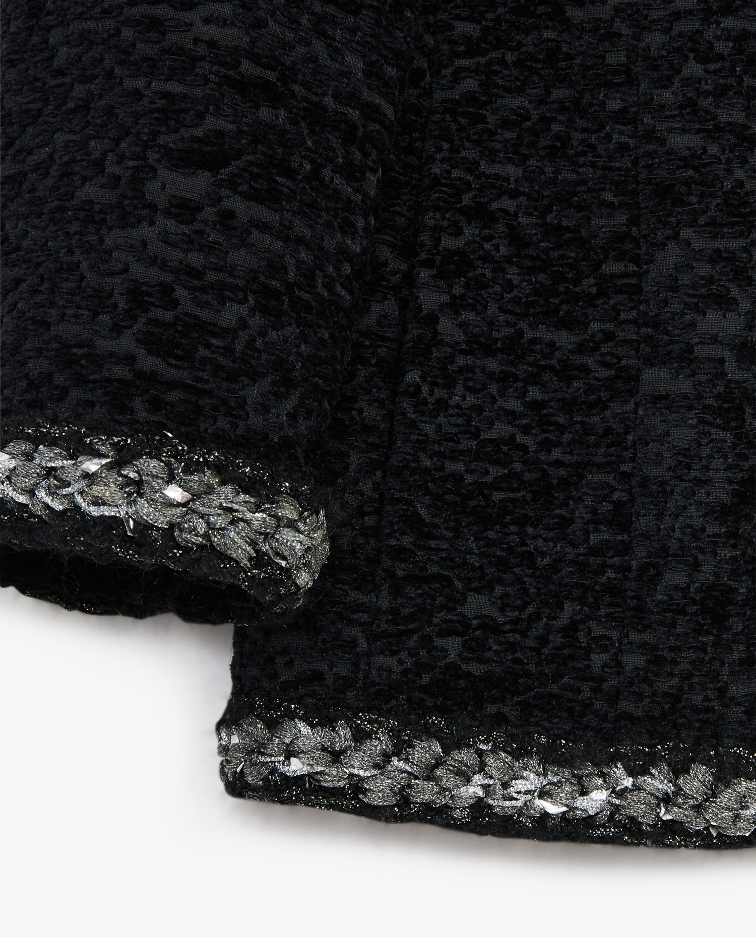 Veste Chanel de la Collection “Le supermarché version Chanel” Automne/Hiver 2014/15. Fermeture zippée. Broderies fils argentés sur le col, le bas et les poignées. Doublure soie noire. En très bon état. Il manque l’étiquette de taille et de composition.