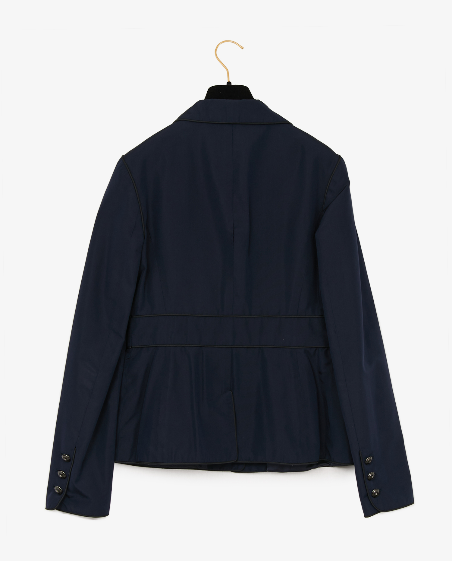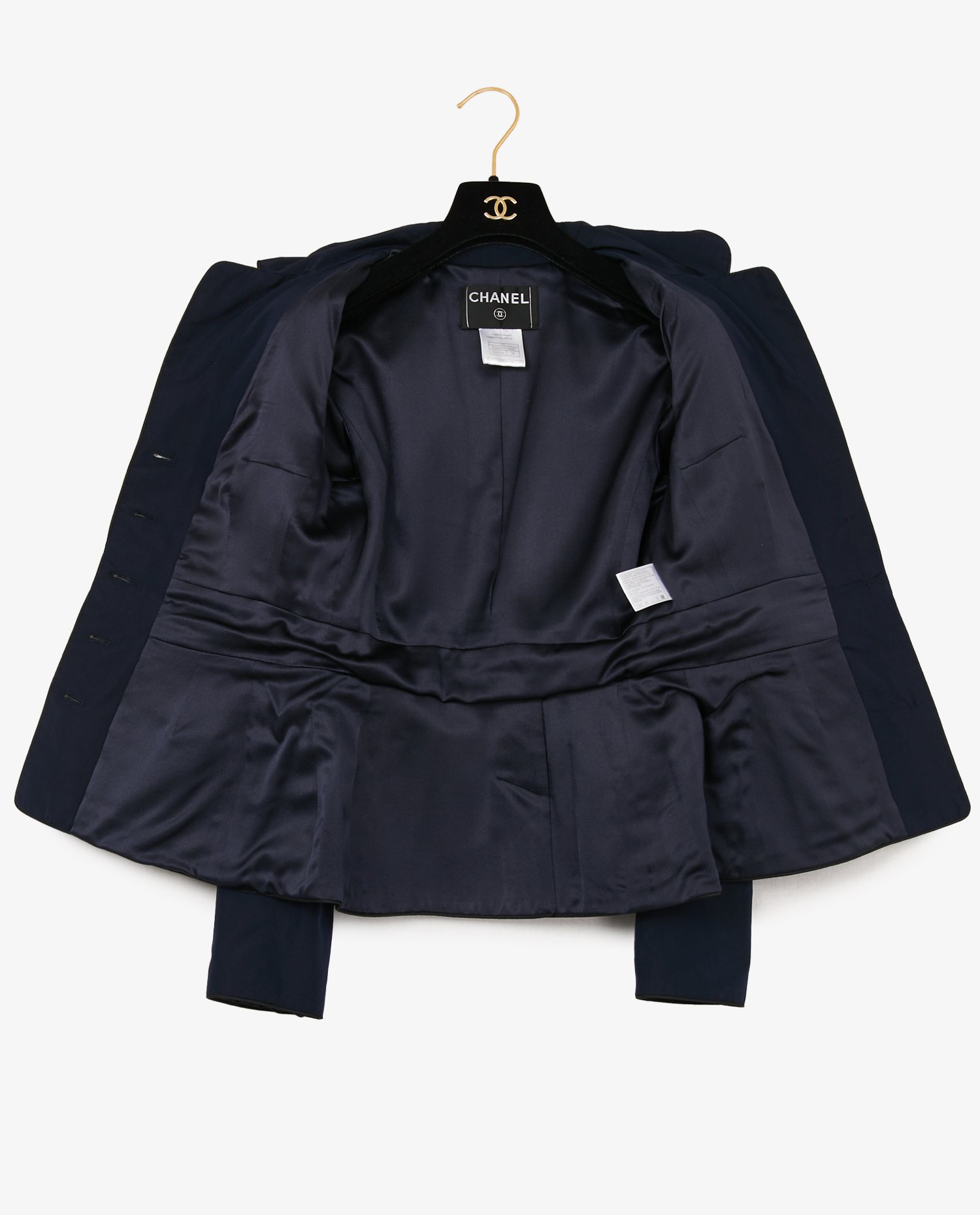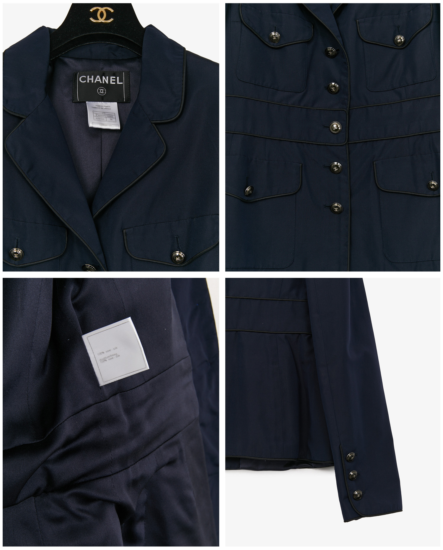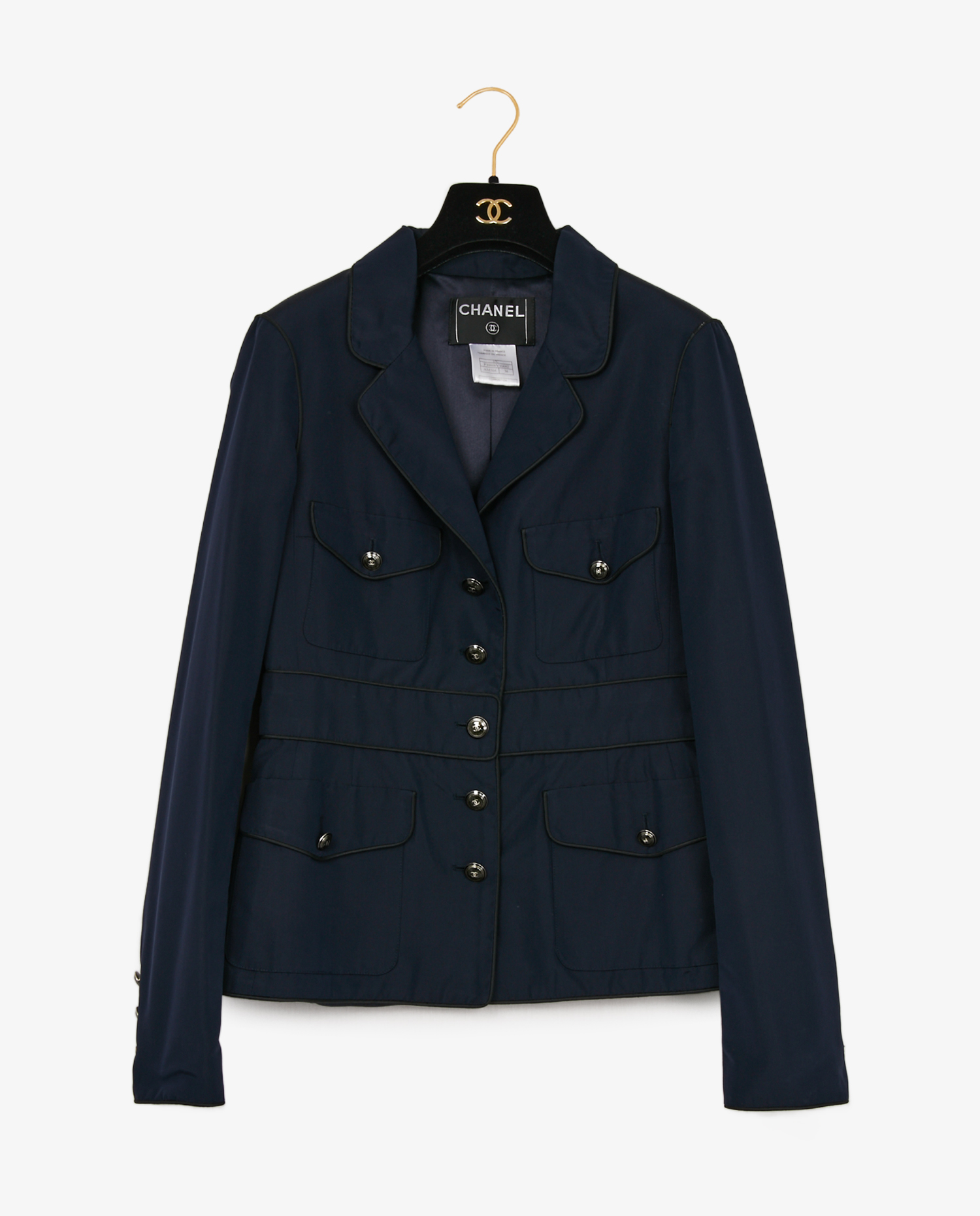 Veste Chanel vintage en soie bleu marine, issue de la collection Croisière 2007/2008. Elle se ferme à l’avant par cinq boutons bombés siglés “CC”, ornés de paillettes. Le devant présente quatre poches plaquées, chacune fermée par un bouton. Les manches longues sont décorées de trois boutons de chaque côté. La coupe est cintrée, entièrement doublée de soie bleu marine. Pièce présentée lors de la collection croisière 2007/2008 présentée par Karl Lagerfeld à l’aéroport de Santa Monica, en Californie. La collection se distinguait par des silhouettes évoquant l’uniforme du capitaine et la tenue de voyageur de première classe avec une esthétique jet-set. Taille 38. En excellent état.