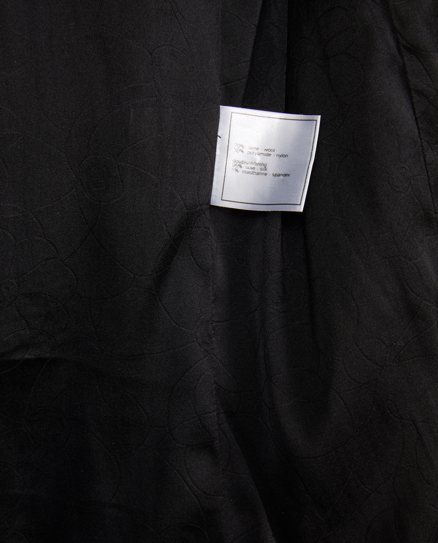Veste croisée Chanel tweed bicolore noir et blanc. Doublure soie camélias. Boutons sigles. Deux poches plaquées à l’avant. En très bon état.