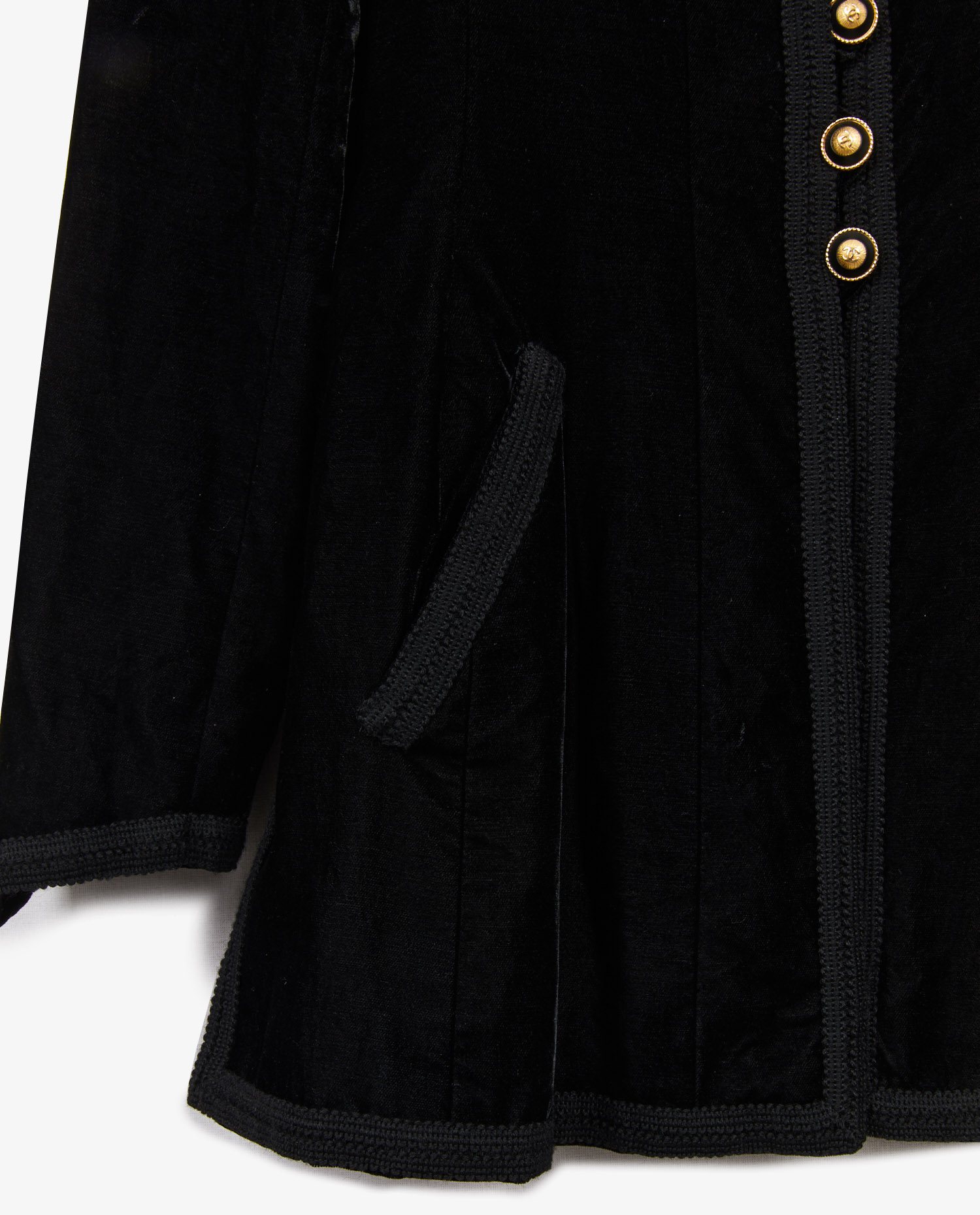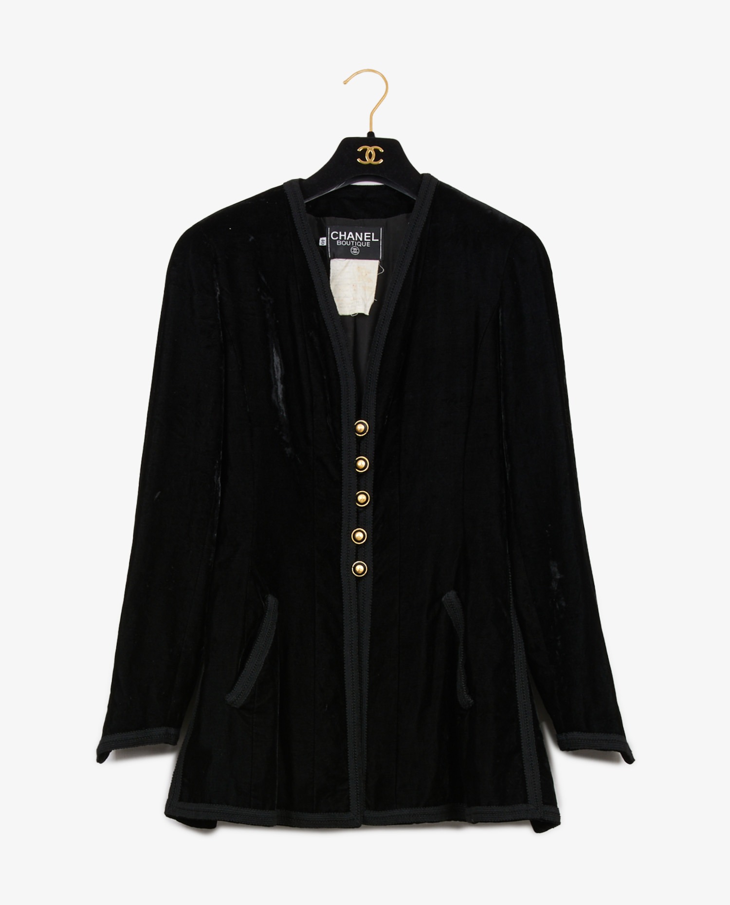 Veste Chanel vintage en velours noir. Doublure en soie noire. Boutons sigles CC dorés. En très bon état.