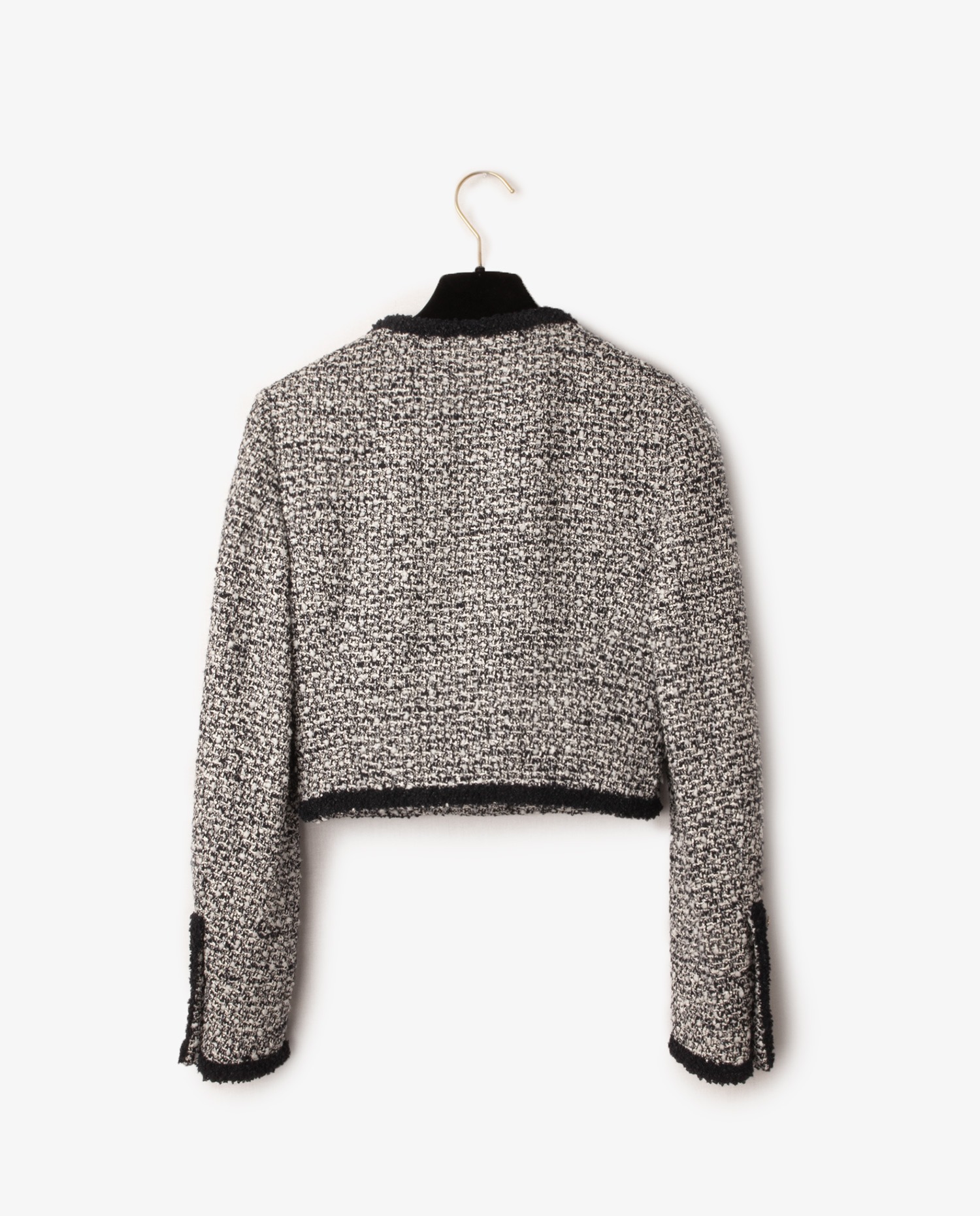 Veste courte et cintrée en tweed bleu et blanche. Taille 34. Fermeture par des boutons siglés CC. Doublure en soie. Deux poches plaquées à l’avant.