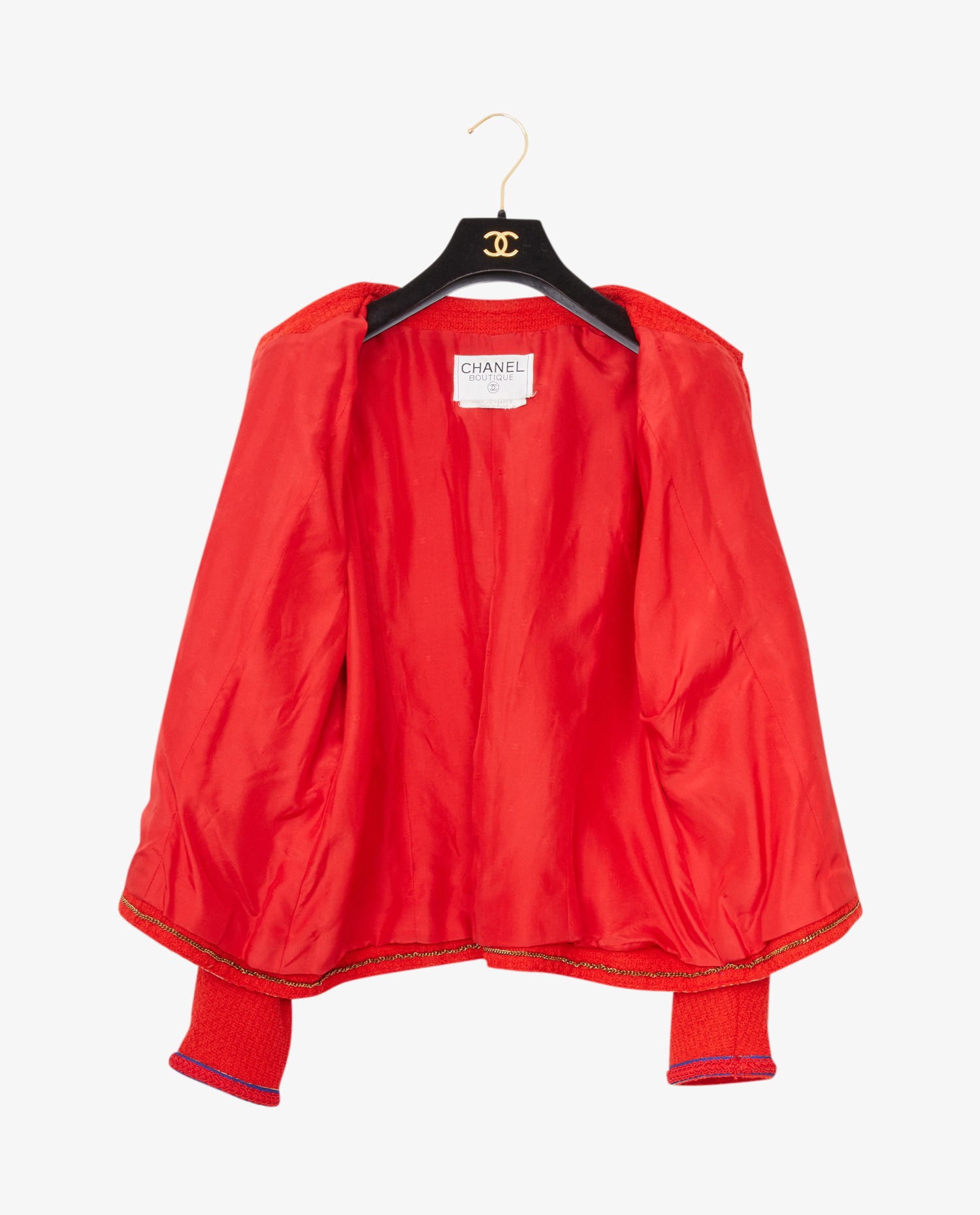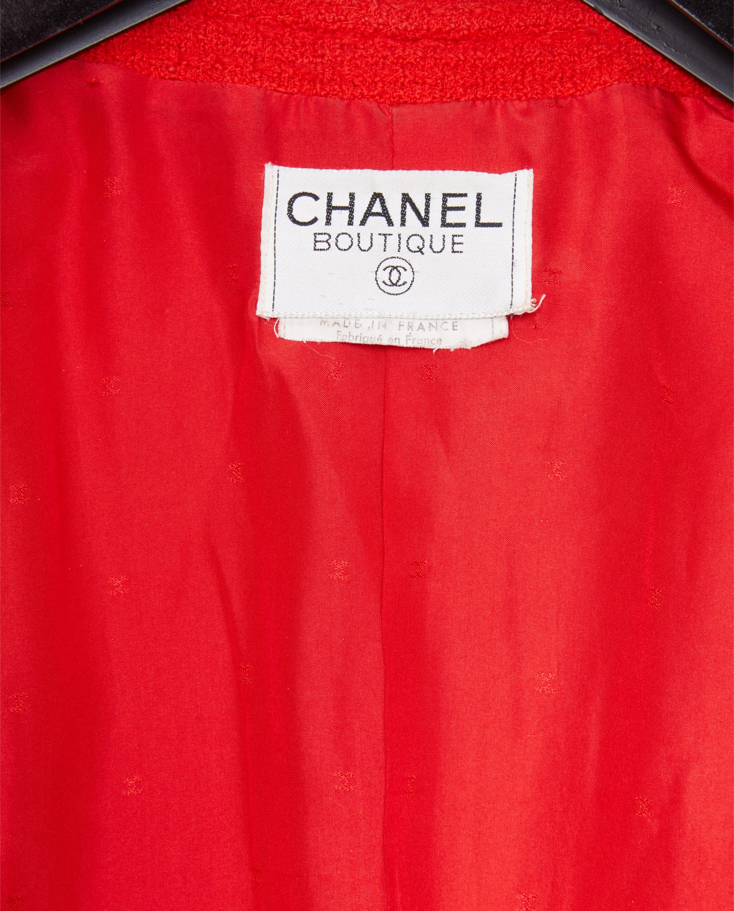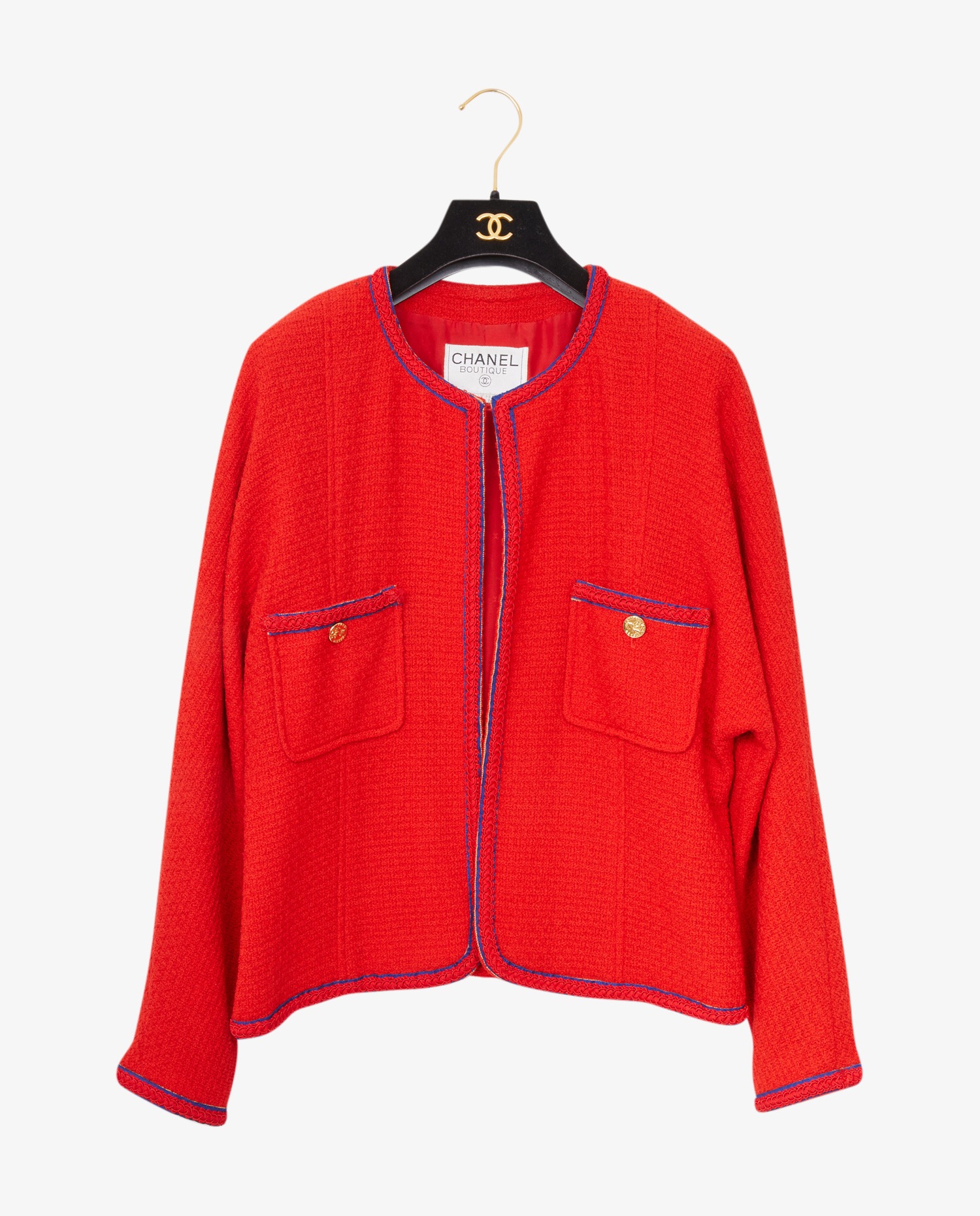 Veste Chanel tweed rouge. Doublure en soie rouge siglée CC. Fermeture par un crochet.