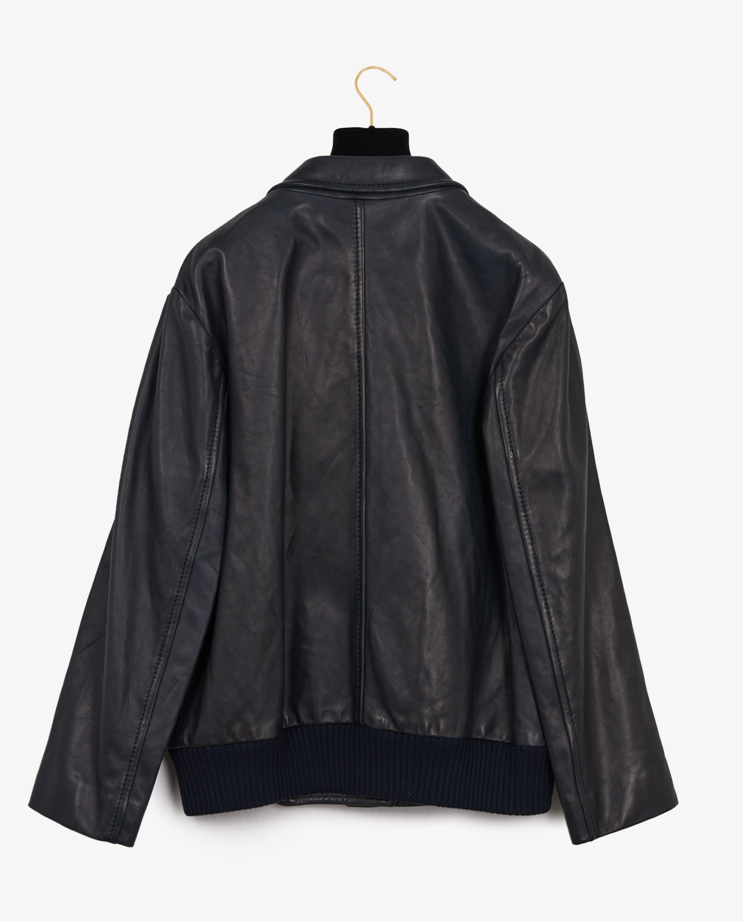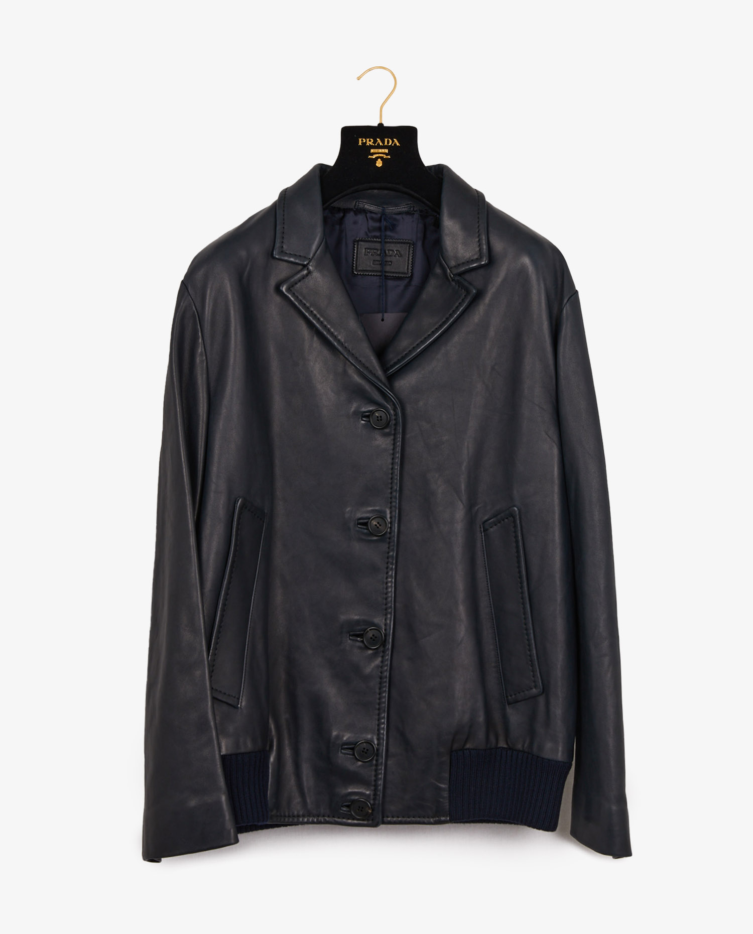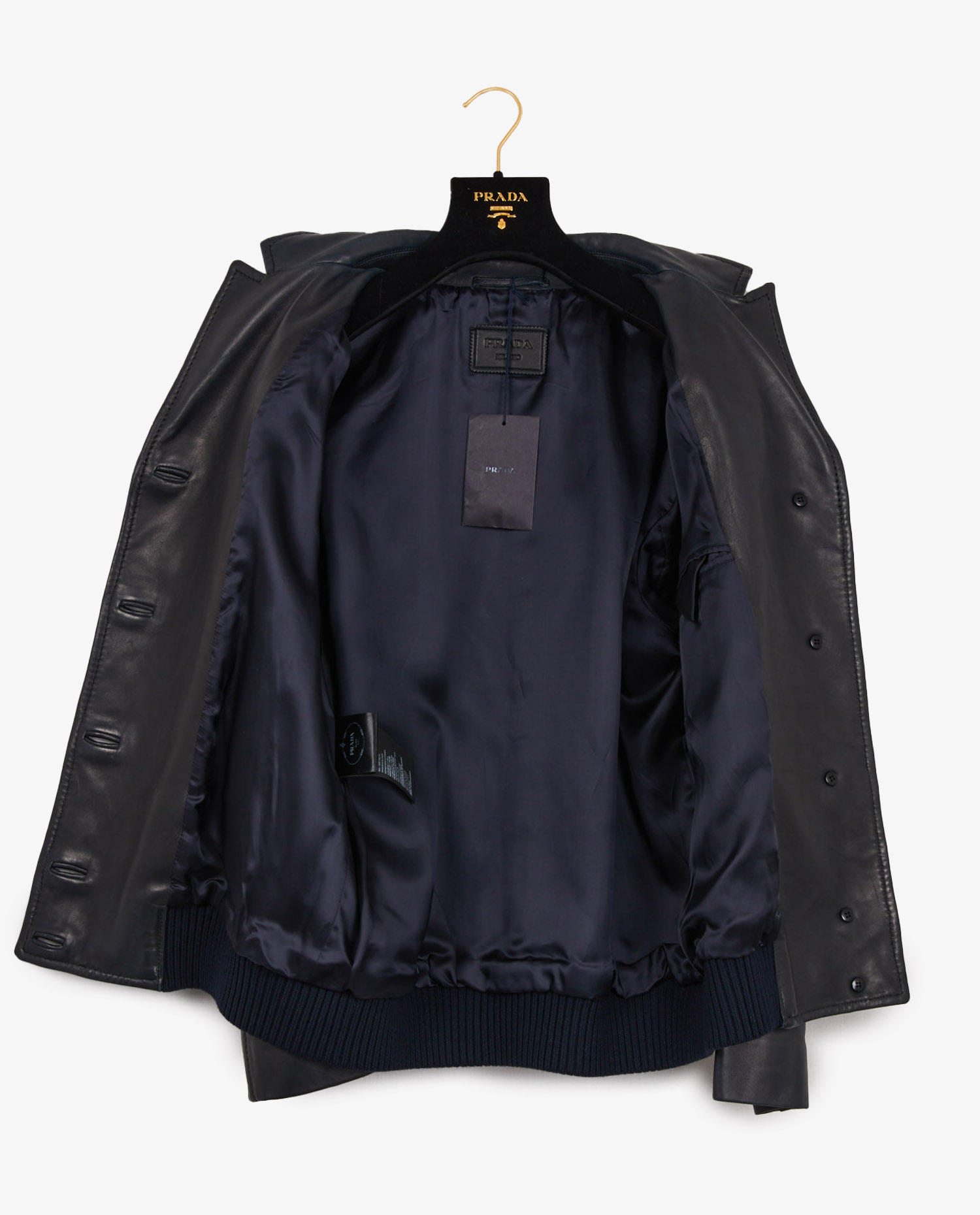 Veste en cuir d’agneau Prada bleu marine. Boutonnage à l’avant. Cintrée à la taille. Doublure soie de la même couleur. Jamais porté, étiquette de marque toujours présente.