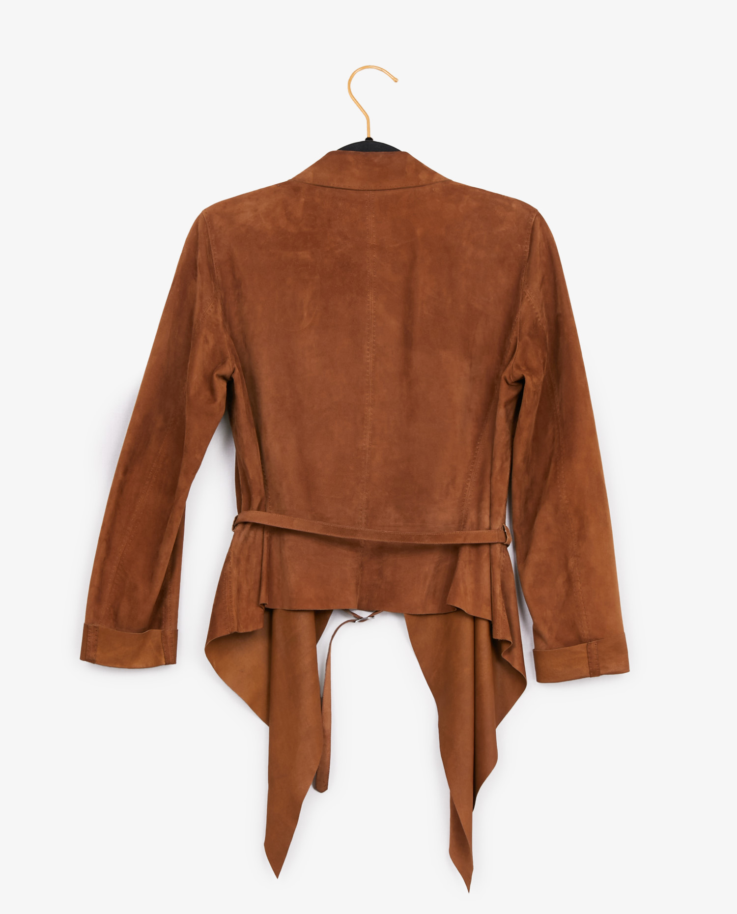 Le daim marron clair présente une texture veloutée, douce au toucher, avec une finition mate typique des cuirs suédés naturels non pigmentés. La coupe est structurée par des coutures fines et précises, soulignant les épaules et le dos. Le col tailleur apporte une touche classique, contrastant subtilement avec la souplesse du reste de la veste. Les manches longues sont légèrement ajustées avec un revers simple aux poignets. La ceinture en cuir assortie est intégrée dans des passants fins et peut se nouer librement à l’avant ou dans le dos.