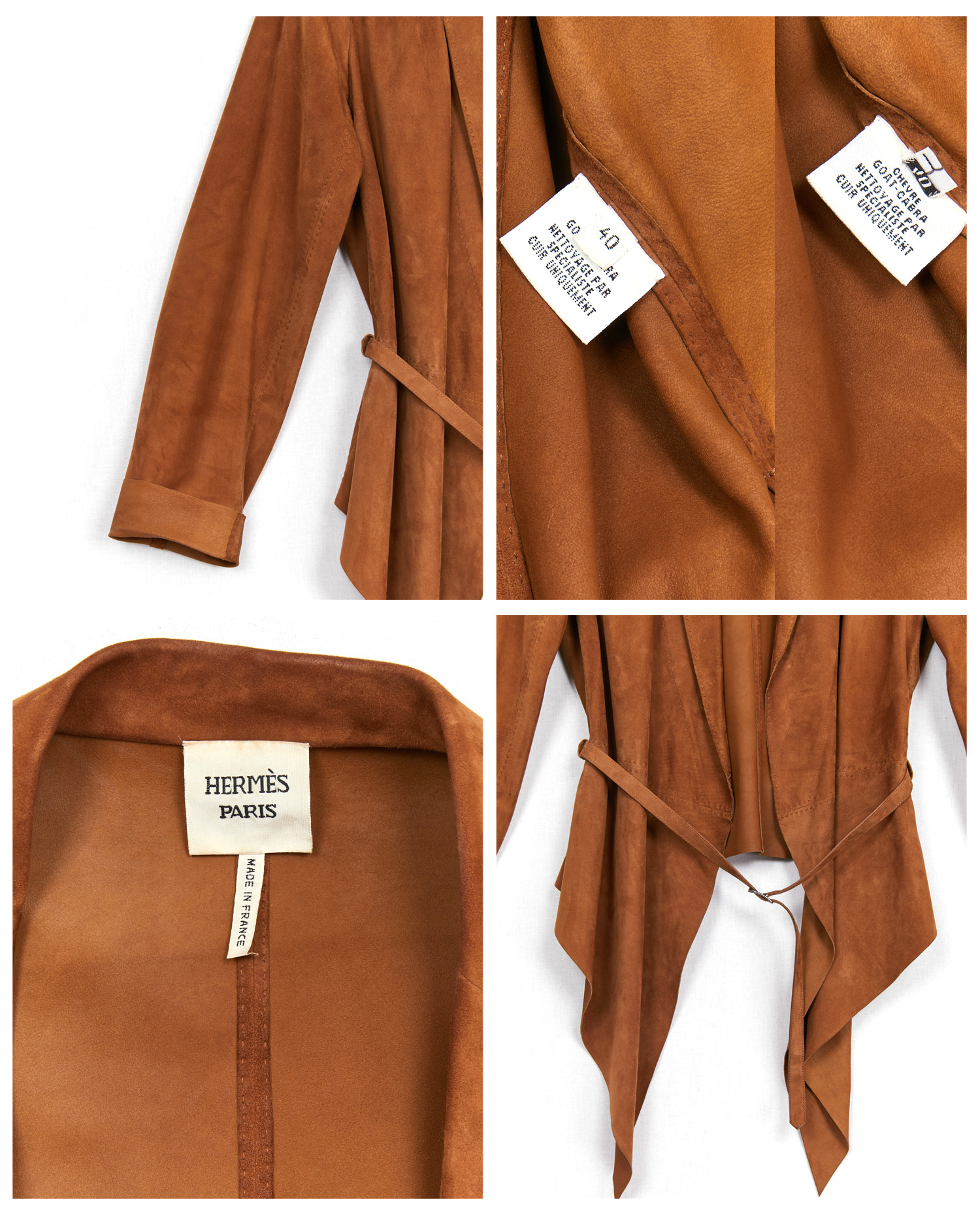 Hermès, fondée en 1837, est mondialement reconnue pour sa maîtrise exceptionnelle du cuir. Si la maison débute dans la sellerie, elle étend au fil du XXe siècle son expertise aux vêtements en cuir haut de gamme. Les vestes en daim font partie de cet héritage, combinant luxe discret et confort. Ce type de modèle fluide sans fermeture rigide s’inscrit dans une esthétique contemporaine née dans les années 2000, où Hermès explore des lignes plus souples, inspirées du mouvement et du corps.