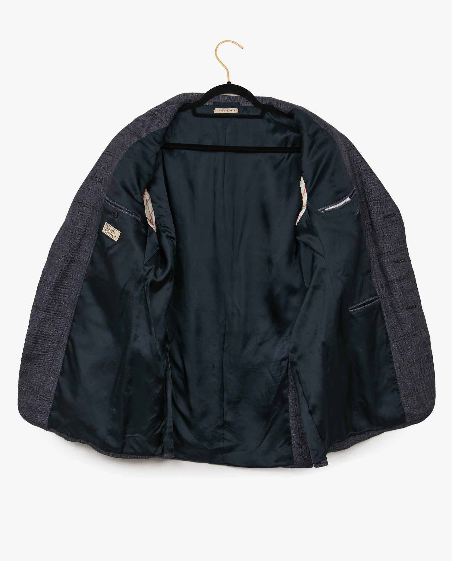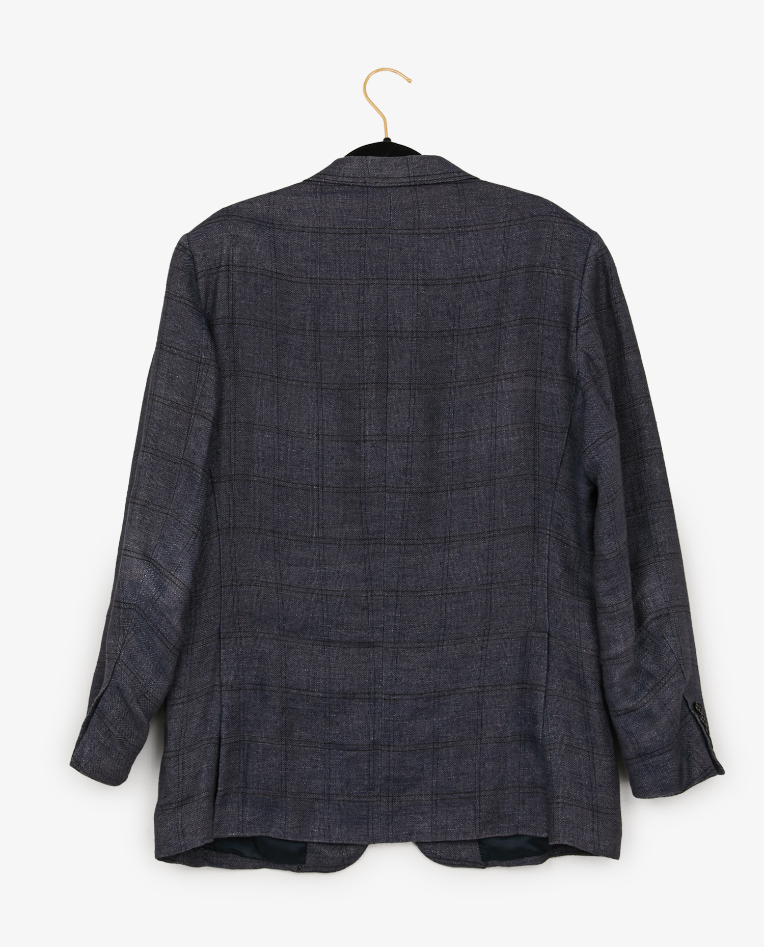 La veste présente un motif prince-de-galles discret en gris-bleuté. Les trois boutons frontaux ton sur ton renforcent la ligne épurée de la pièce. Les poches à rabat sont finement travaillées et la poche poitrine discrète permet d’y glisser un mouchoir ou une pochette. Les épaules sont légèrement structurées sans excès, offrant un tombé naturel et élégant.