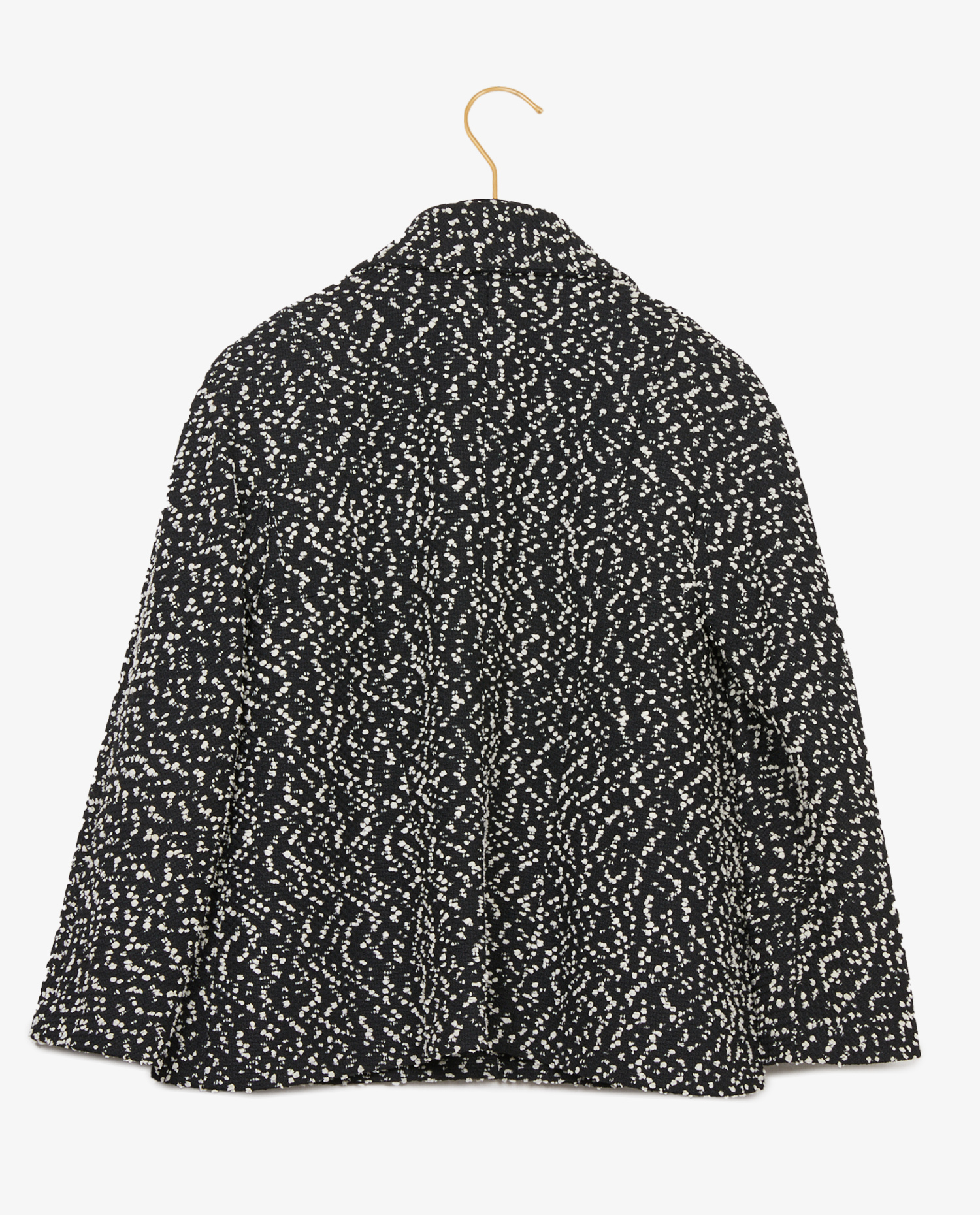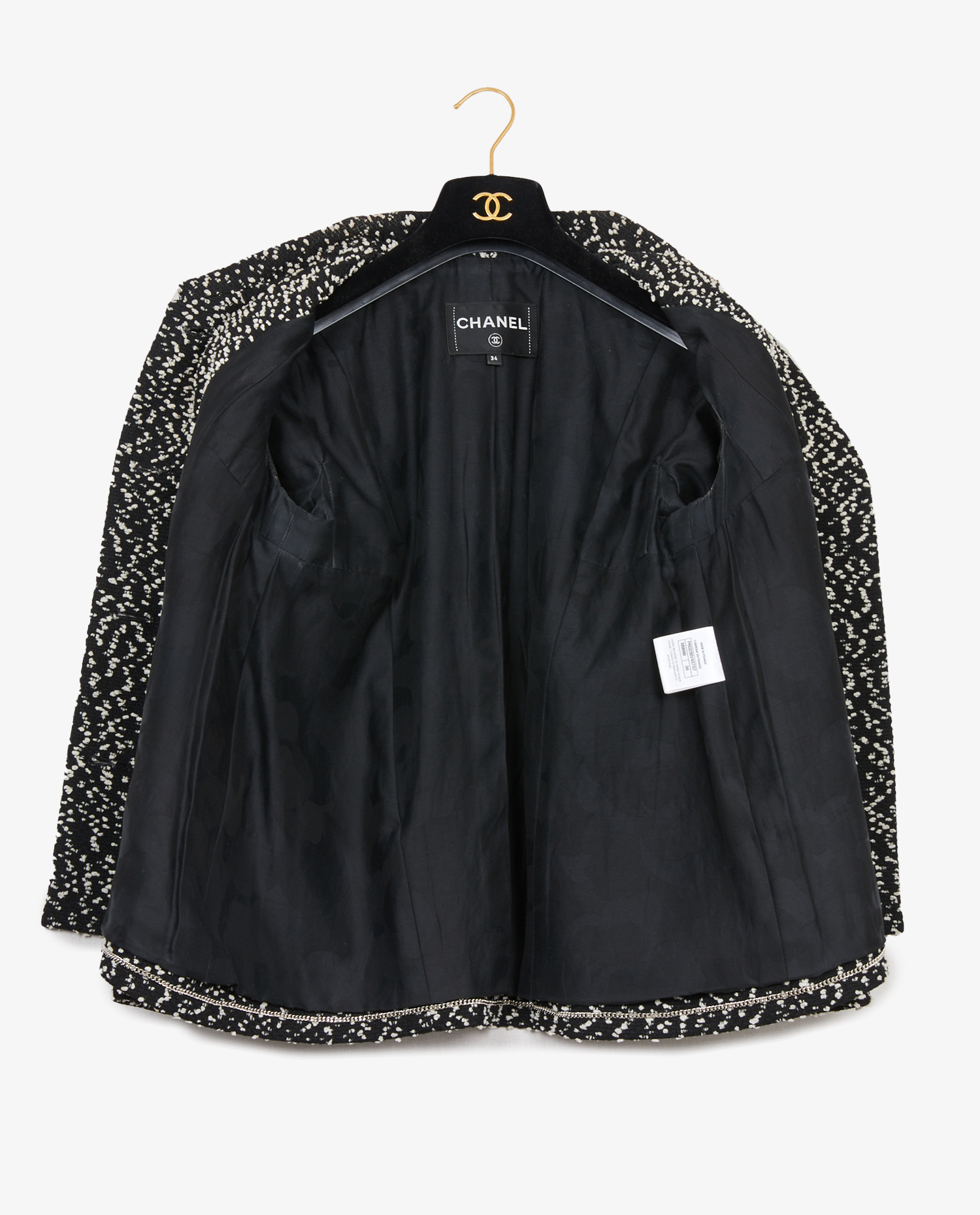 Très belle veste Chanel issue la collection Croisière rebaptisé La Pausa 2018/2019. Confectionnée dans un tweed noir et blanc au charme intemporel, elle présente une coupe trapèze fluide, des épaules subtilement structurées et des manches raglan 3/4, offrant une allure à la fois chic et décontractée.
