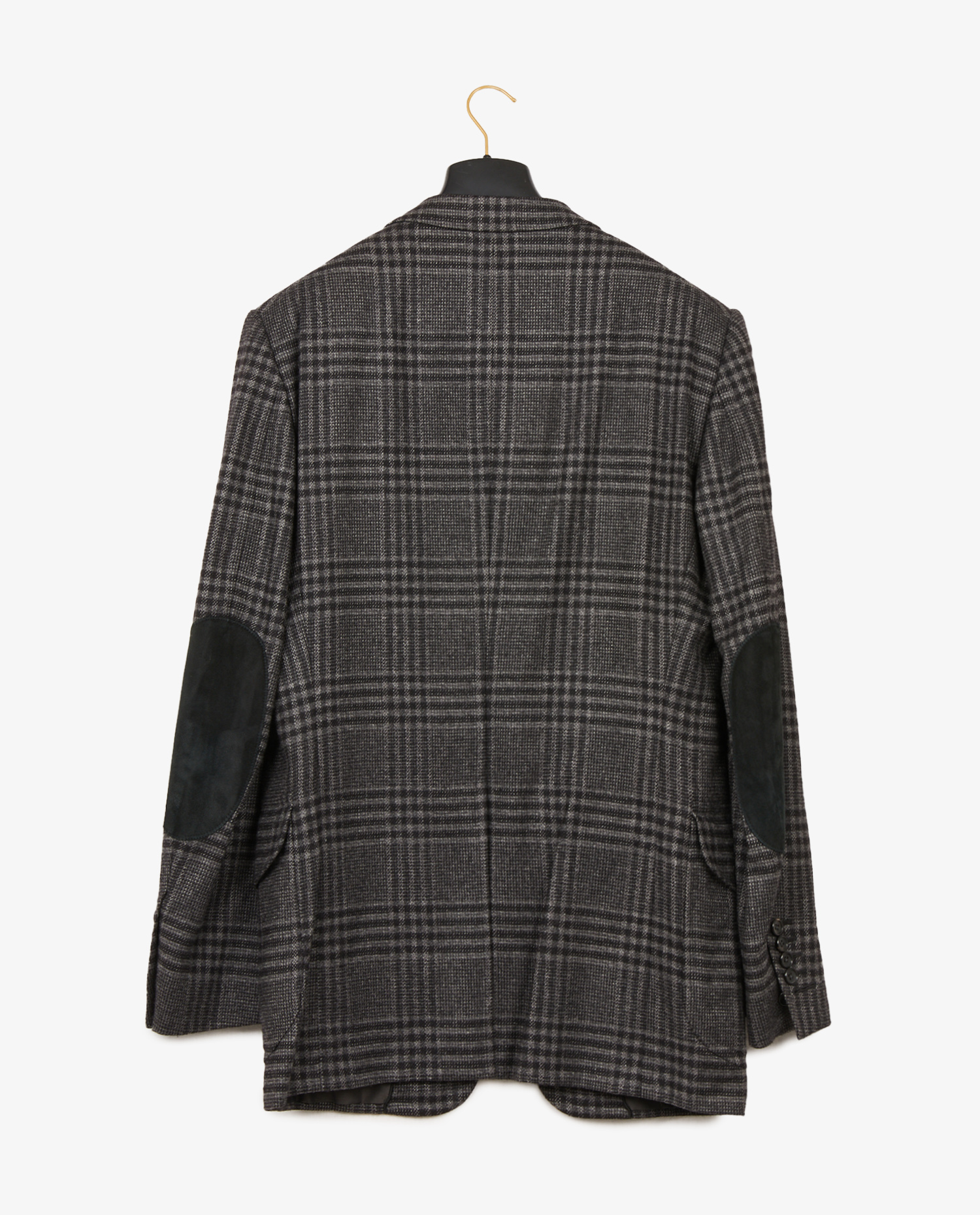 La veste présente un tissage dense et doux mêlant 50 % laine, 26 % soie et 24 % poil de chameau, assurant un tombé fluide et naturel. Le motif Prince de Galles se décline dans des nuances subtiles de gris et noir, avec une structure à deux boutons en corne foncée, trois poches à rabat et une poche poitrine passepoilée. Les coudières en suédine noire ajoutent une touche fonctionnelle et rétro. Les poignets sont finis avec quatre boutons non ouverts. La longueur, les épaules structurées et la coupe légèrement cintrée valorisent la silhouette avec équilibre.