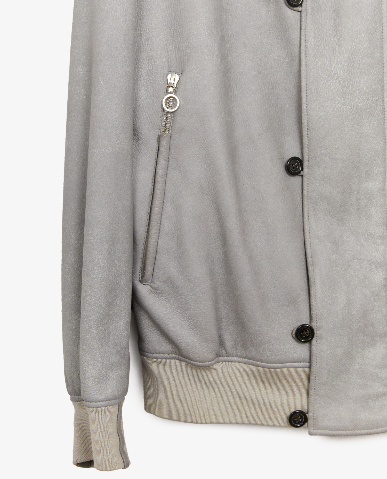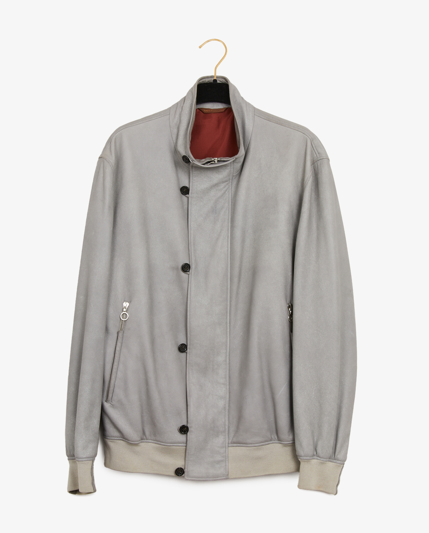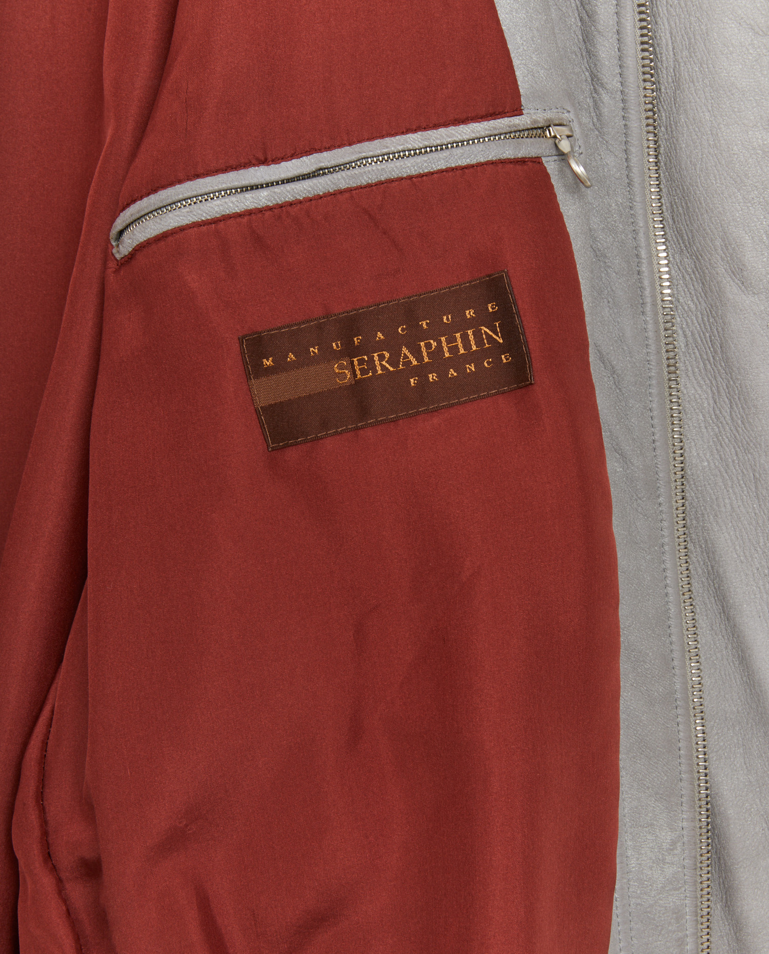 Veste courte Seraphin en cuir d’agneau gris clair. Fermeture zippée et boutonnée. Poches zippées. Doublure soie bordeaux. Taille 54. En très bon état.