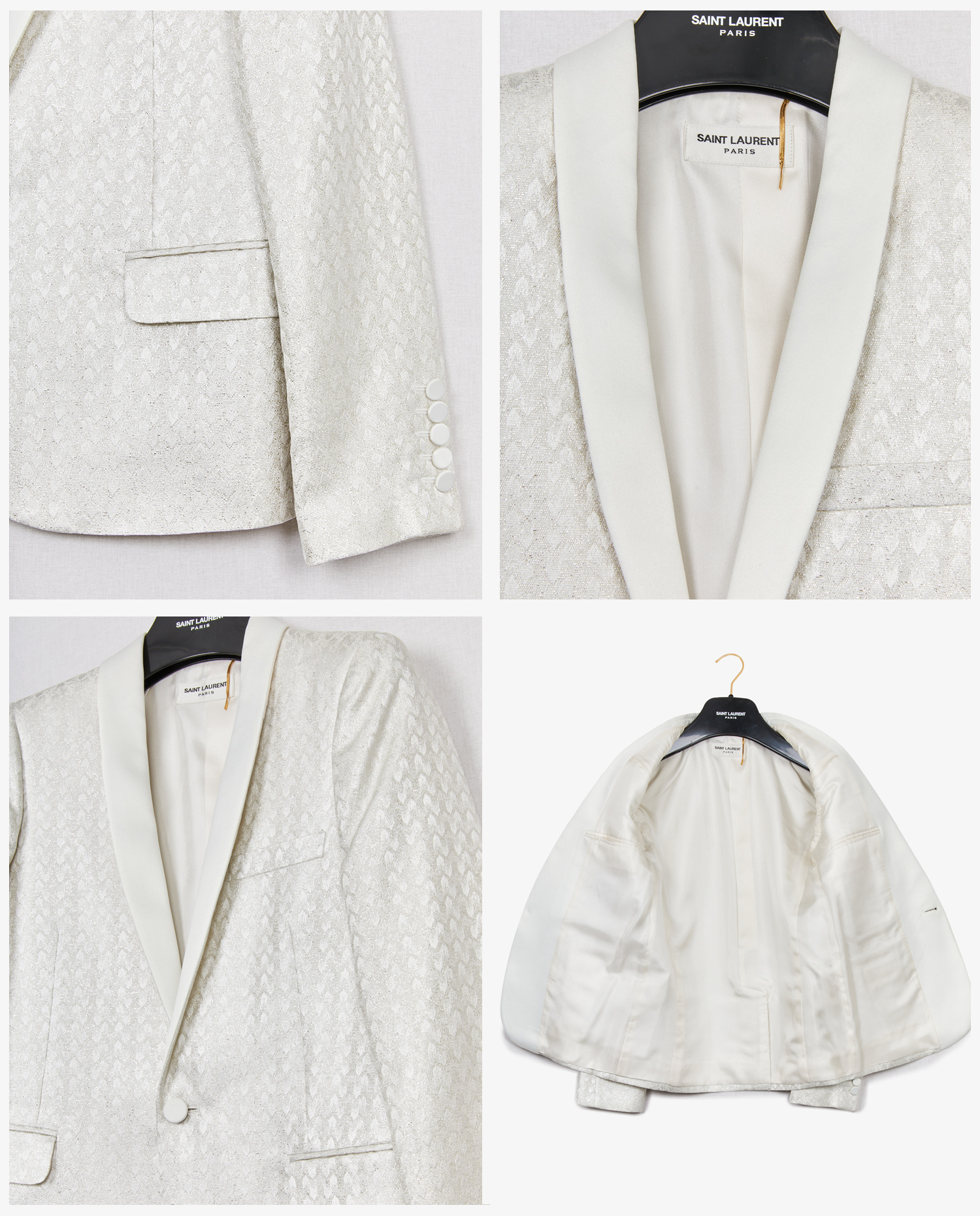 Veste smoking Saint Laurent blanche. Doublure soie blanche. Taille 34. En très bon état.