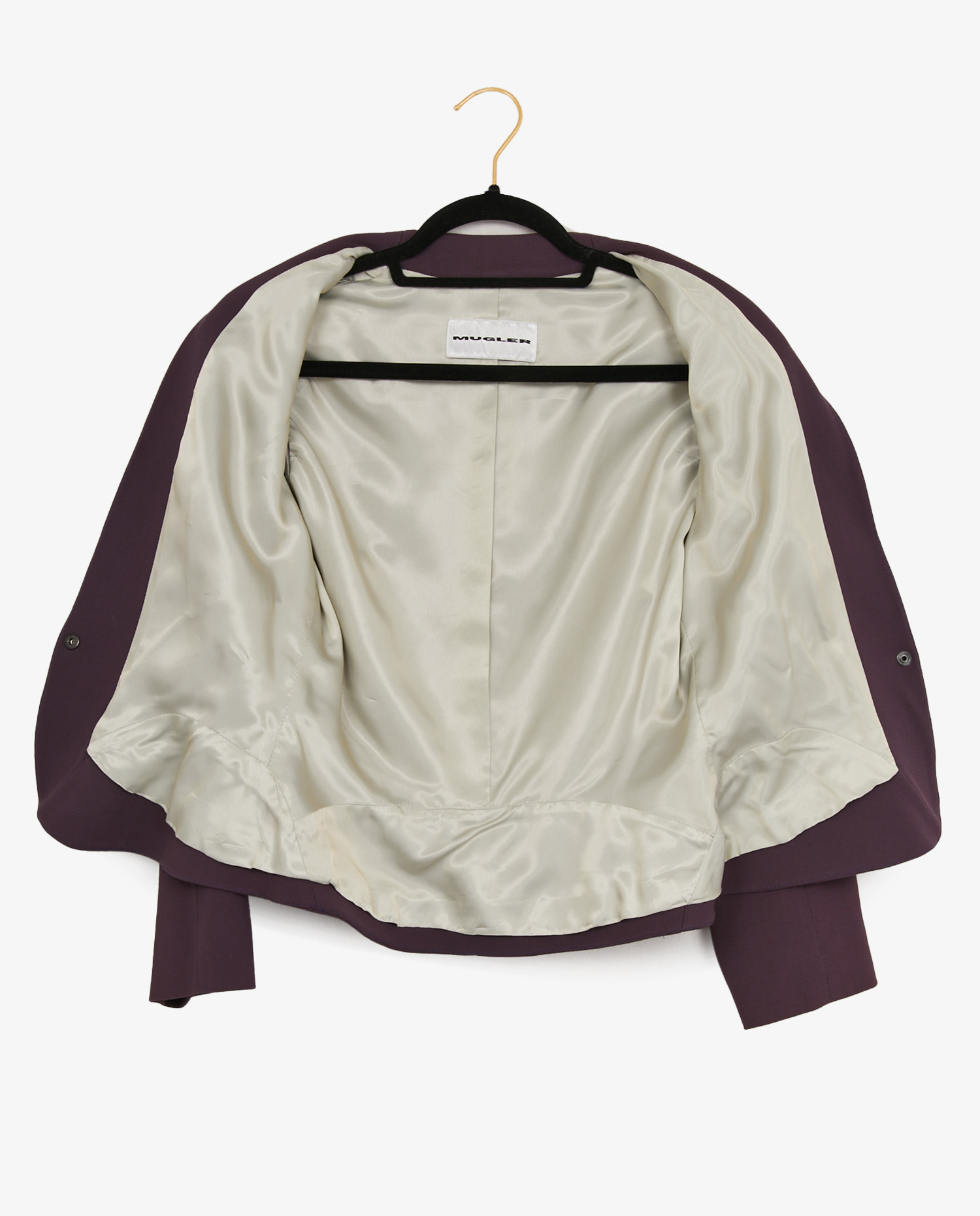 Veste Thierry Mugler vintage de couleur violet. Taille 38. Elle est lacée dans le dos afin d’apporter plus de structure. Il y a des empiècements en velours. Fermeture par bouton pression. Il y a des épaulettes pour apporter ce look vintage. En très bon état.