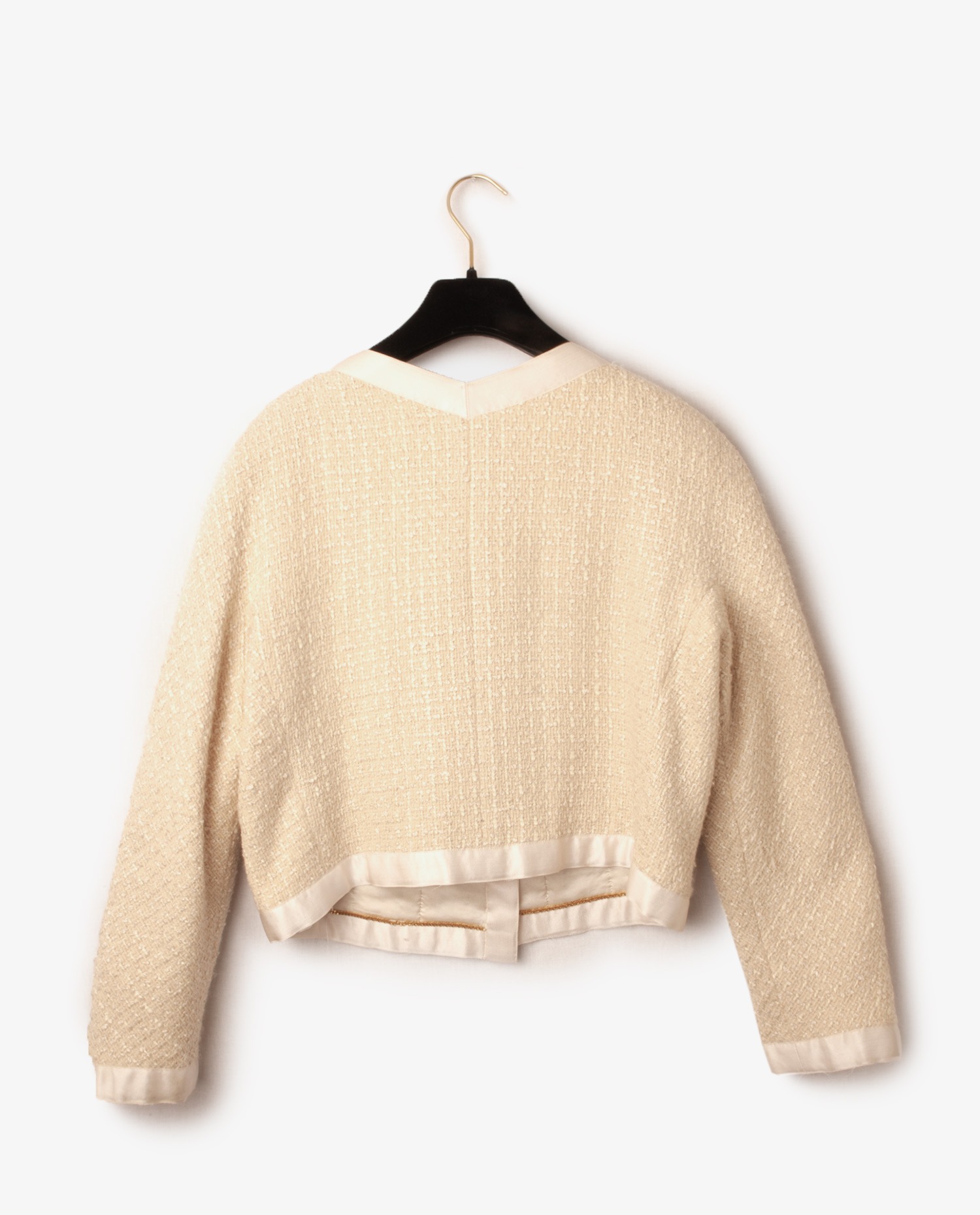 Veste courte Chanel vintage en tweed et bordures en satin beige. Sublime boutons en métal dorés siglés “CC” à l’avant et sur les deux poches plaquées. Doublure en soie cousue à la main.