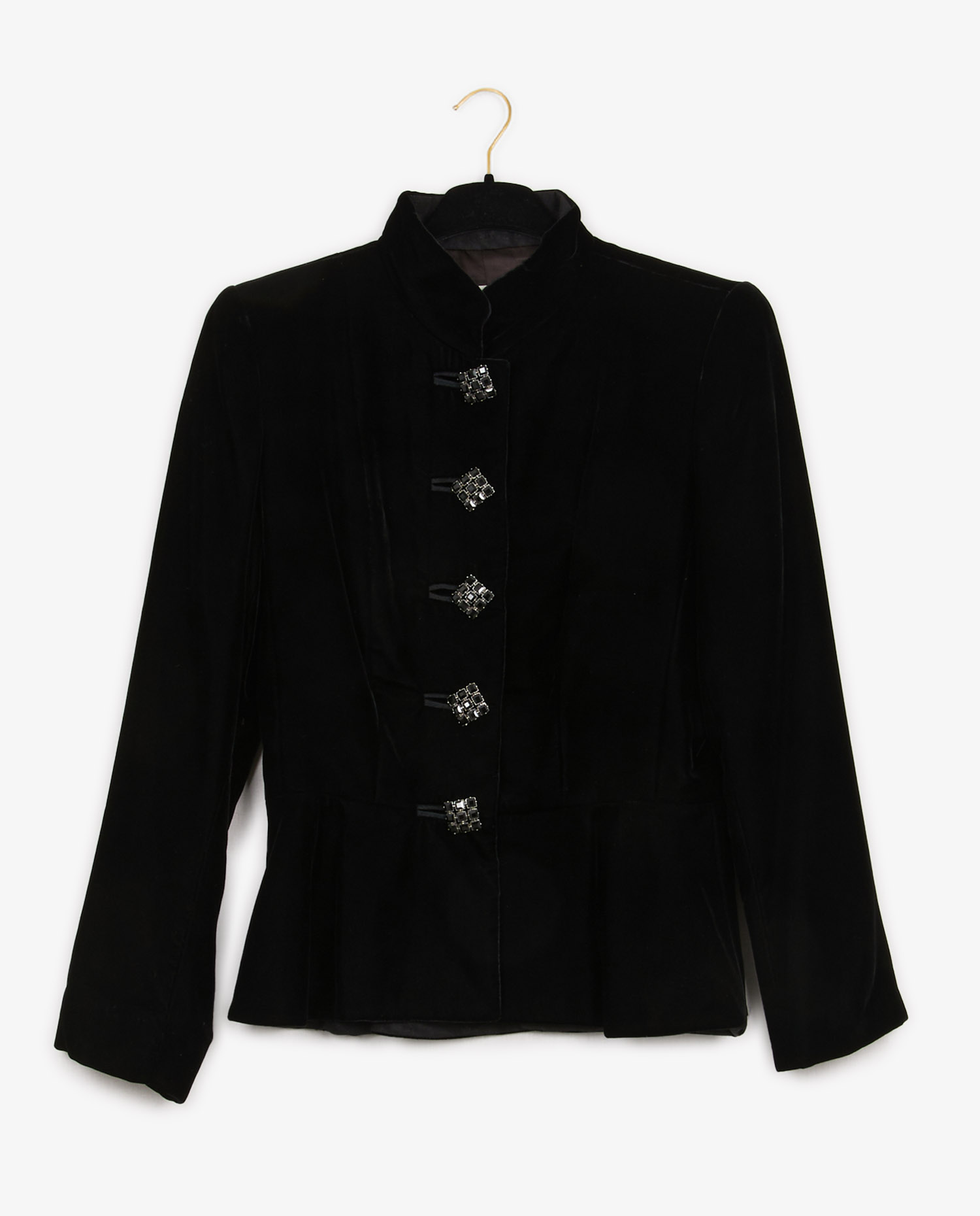 Veste Yves Saint Laurent en velours noire cintrée. Boutons bijoux. Col mao. Doublure en soie. En très bon état.
