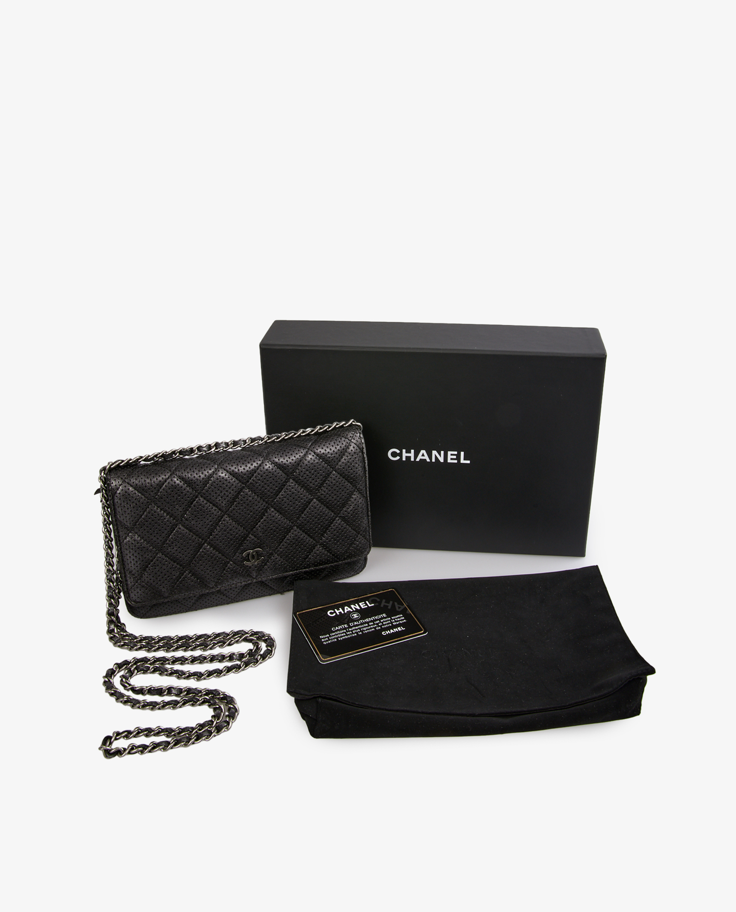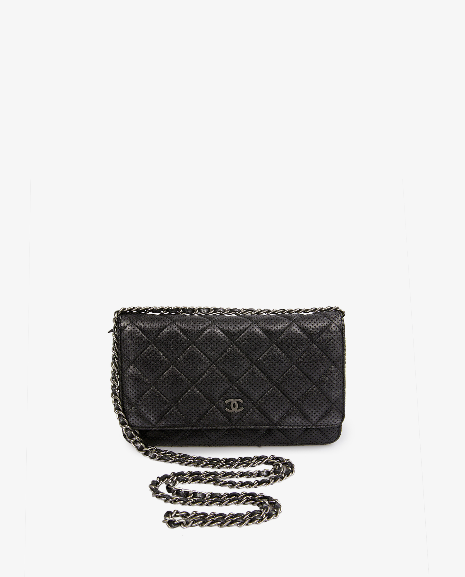 Wallet on chain Chain Chanel en cuir noir perforé. Fermeture par bouton pression. Porté en bandoulière ou comme une pochette. L’intérieur est en tissu noir, 6 fentes pour cartes et une poche zippée. En très bon état. Livré dans son dustbag et boite d’origine.